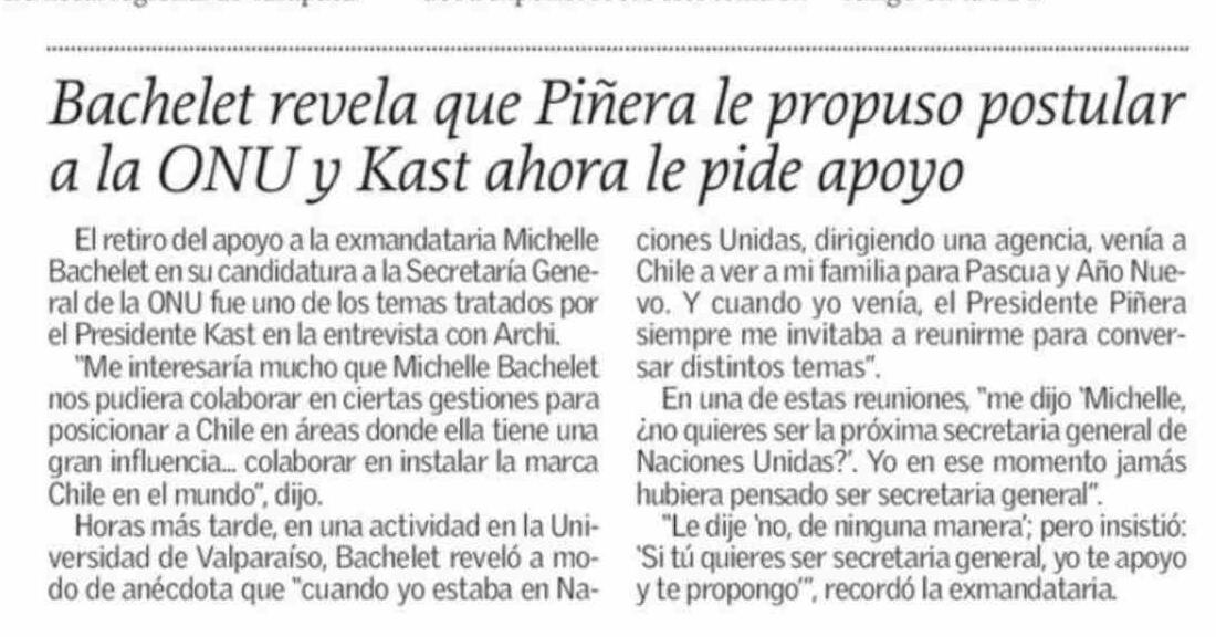 | Título: | ....... Bachelet revela que Piñera le propuso postular a la ONU y Kast ahora le pide apoyo El retiro del apoyo a la exmandataria Michelle ciones Unidas, dirigiendo una agencia, venía a Chile a ver a mi familia para Pascua y Año NueBachelet en su candidatura a la Secretaría Genevo. Y cuando yo venía, |