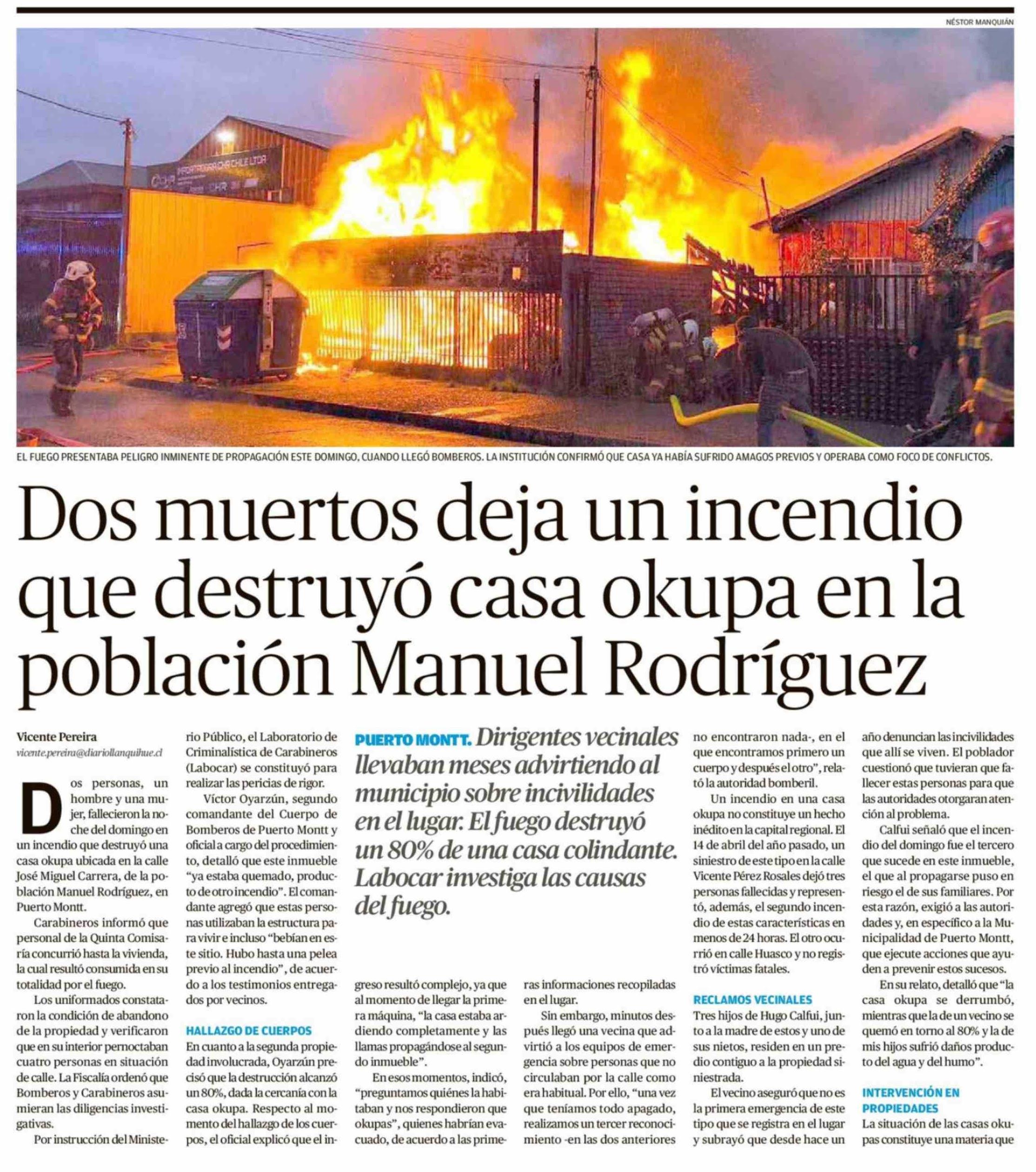 Dos muertos deja un incendio que destruyó casa okupa en la población Manuel Rodríguez
