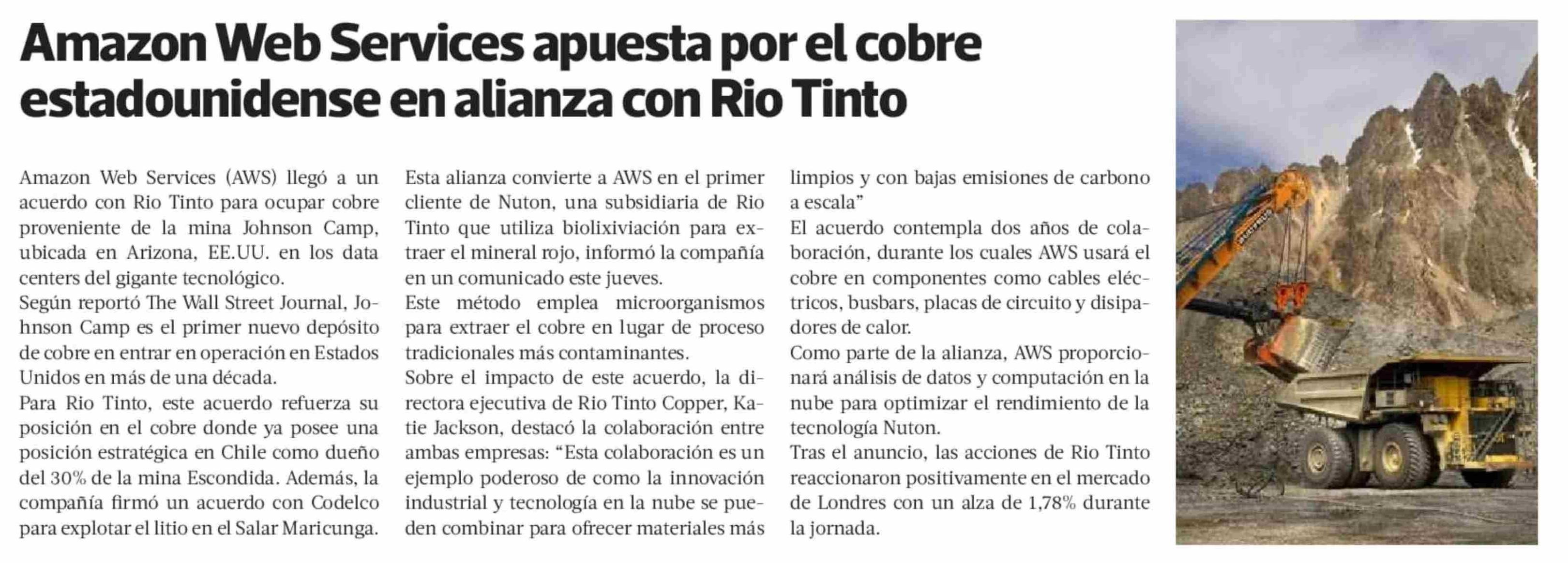 Amazon Web Services apuesta por el cobre estadounidense en alianza con Rio Tinto