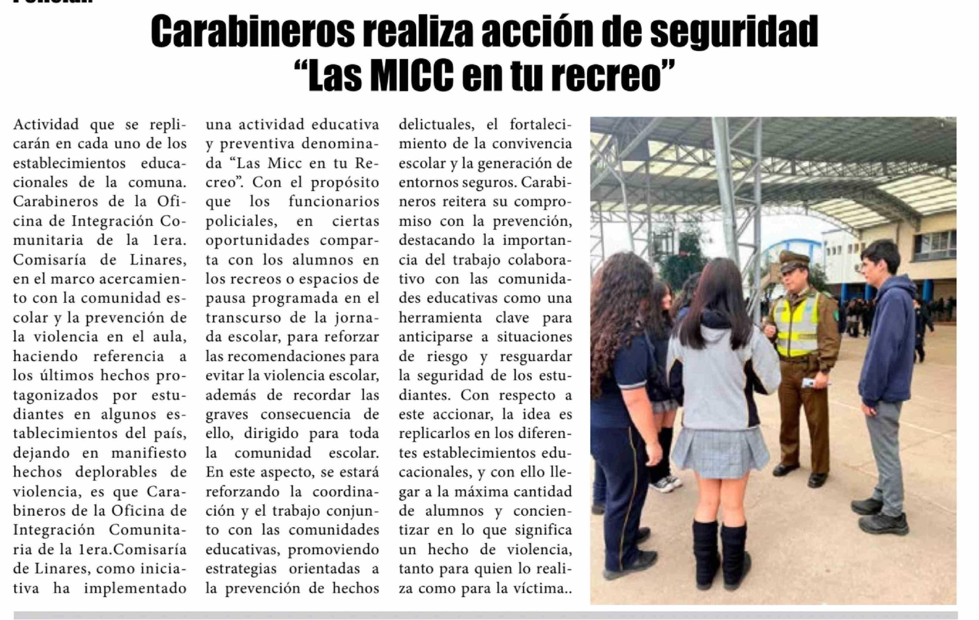 Título: Carabineros realiza acción de seguridad "Las MICC en tu recreo"