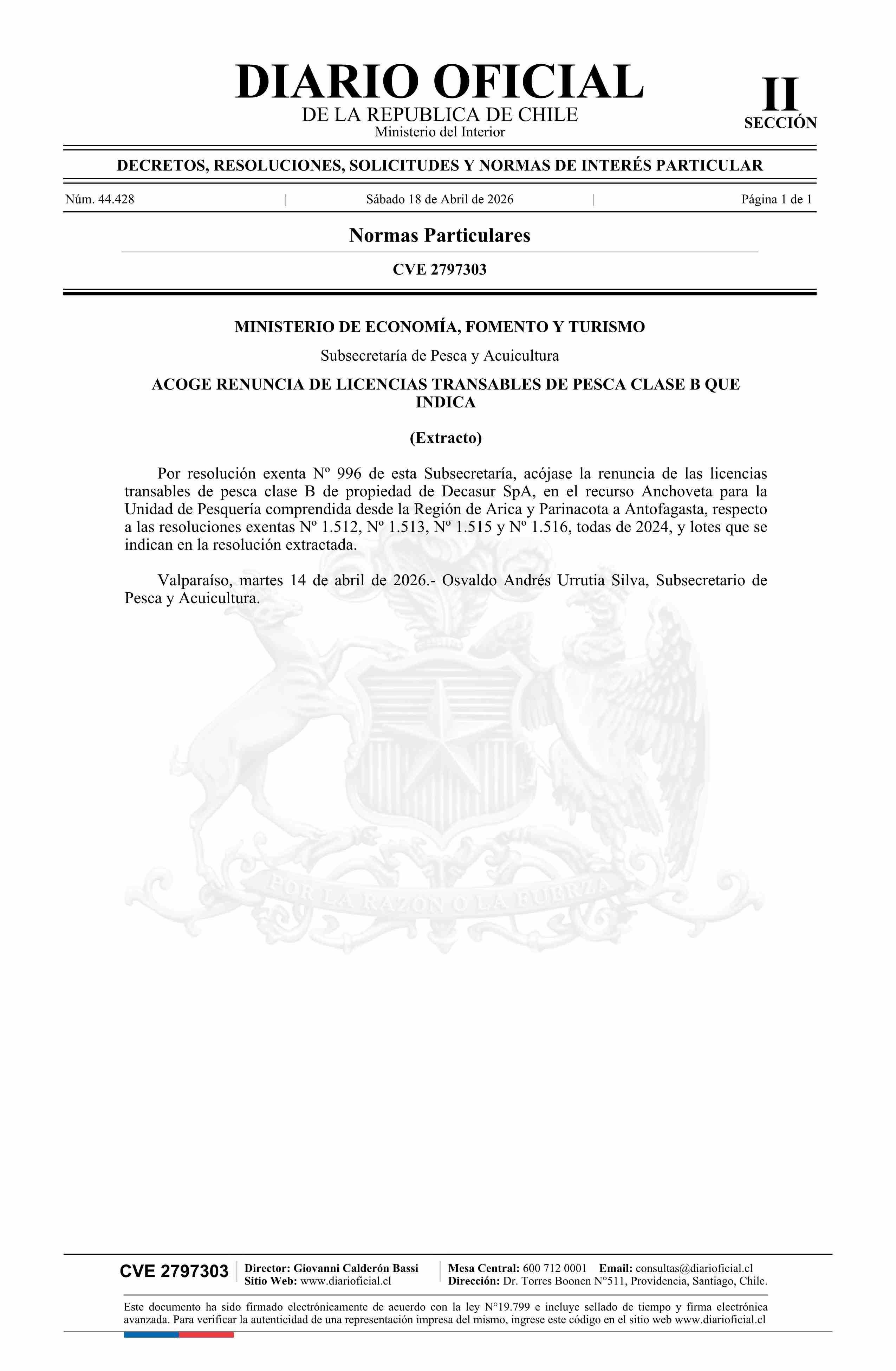 | Título: | Extracto de resolución exenta número 996, de 2026.- Acoge renuncia de licencias transables de pesca clase B que indica |