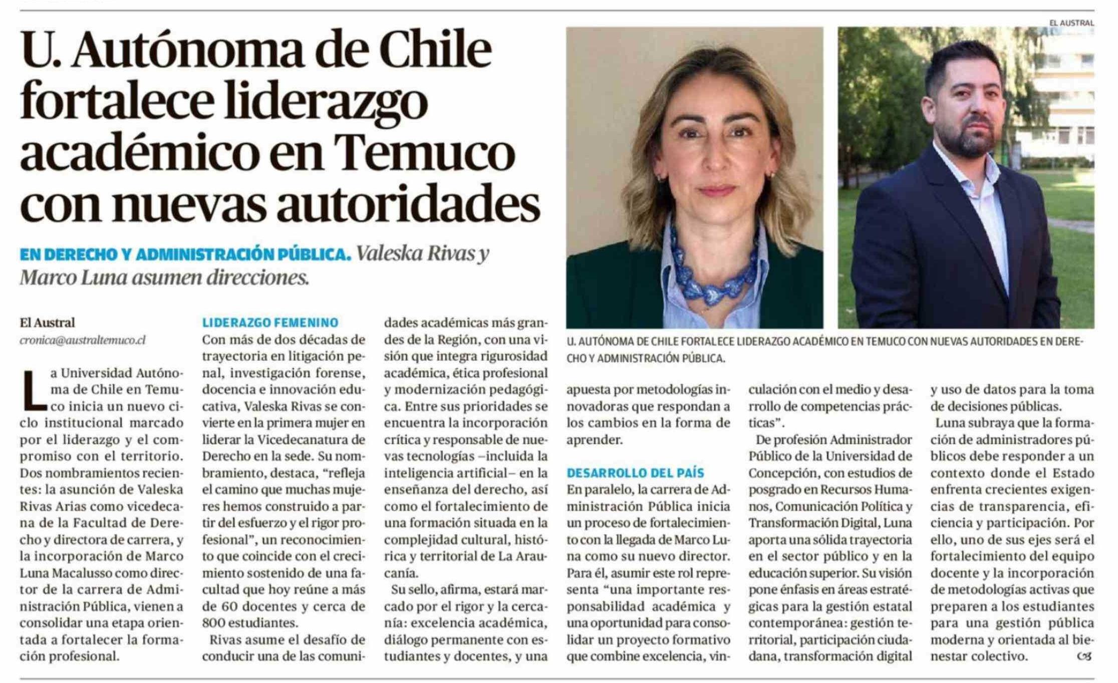 U. Autónoma de Chile fortalece liderazgo académico en Temuco con nuevas autoridades
