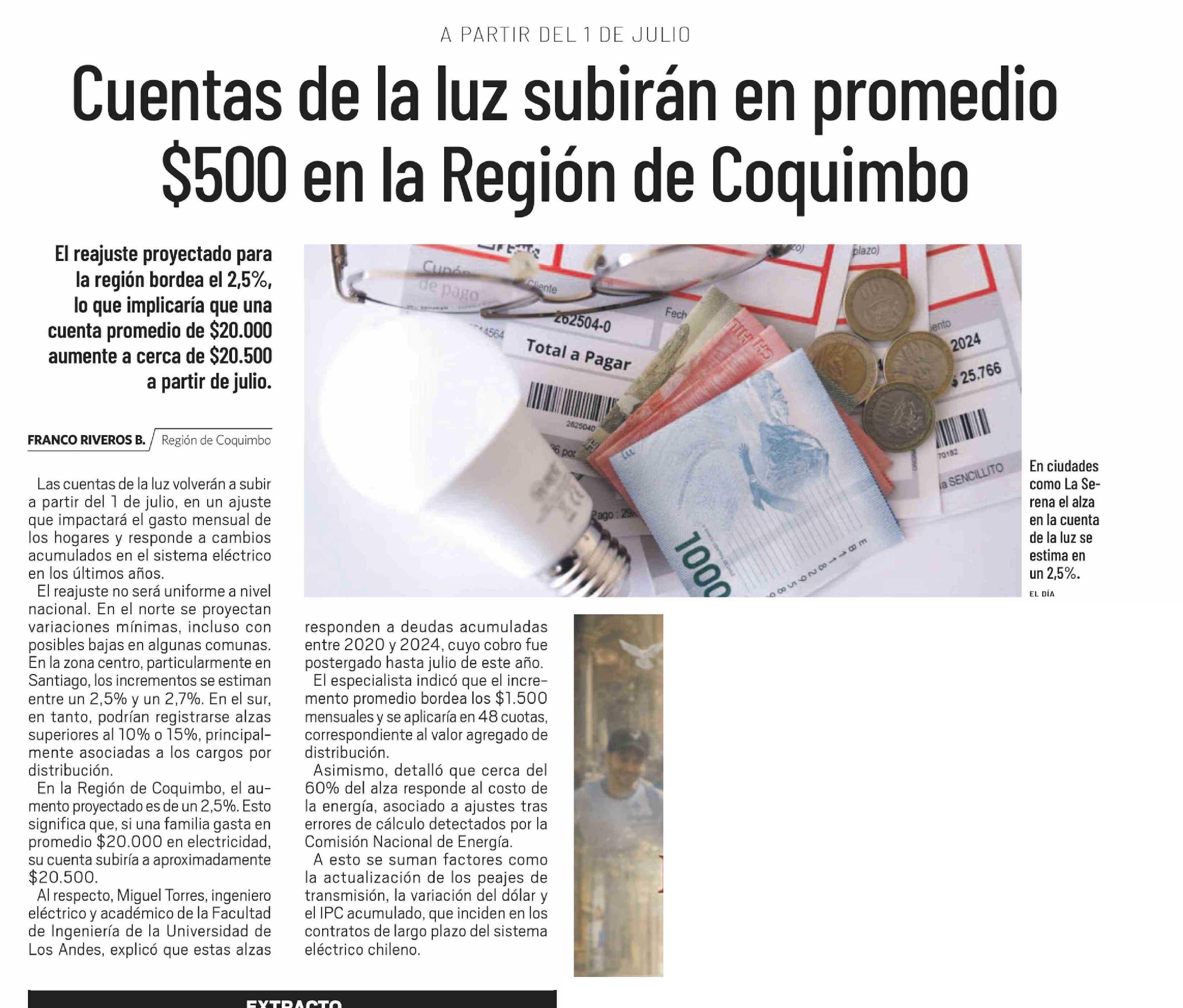 Cuentas de la luz subirán en promedio $500 en la Región de Coquimbo