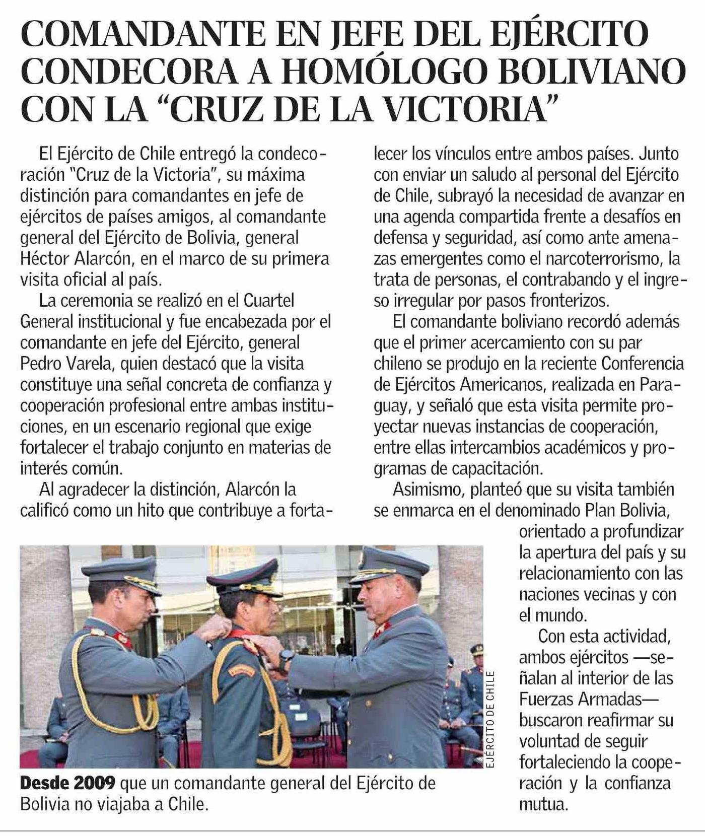 COMANDANTE EN JEFE DEL EJÉRCITO CONDECORA A HOMÓLOGO BOLIVIANO CON LA “CRUZ DE LA VICTORIA”