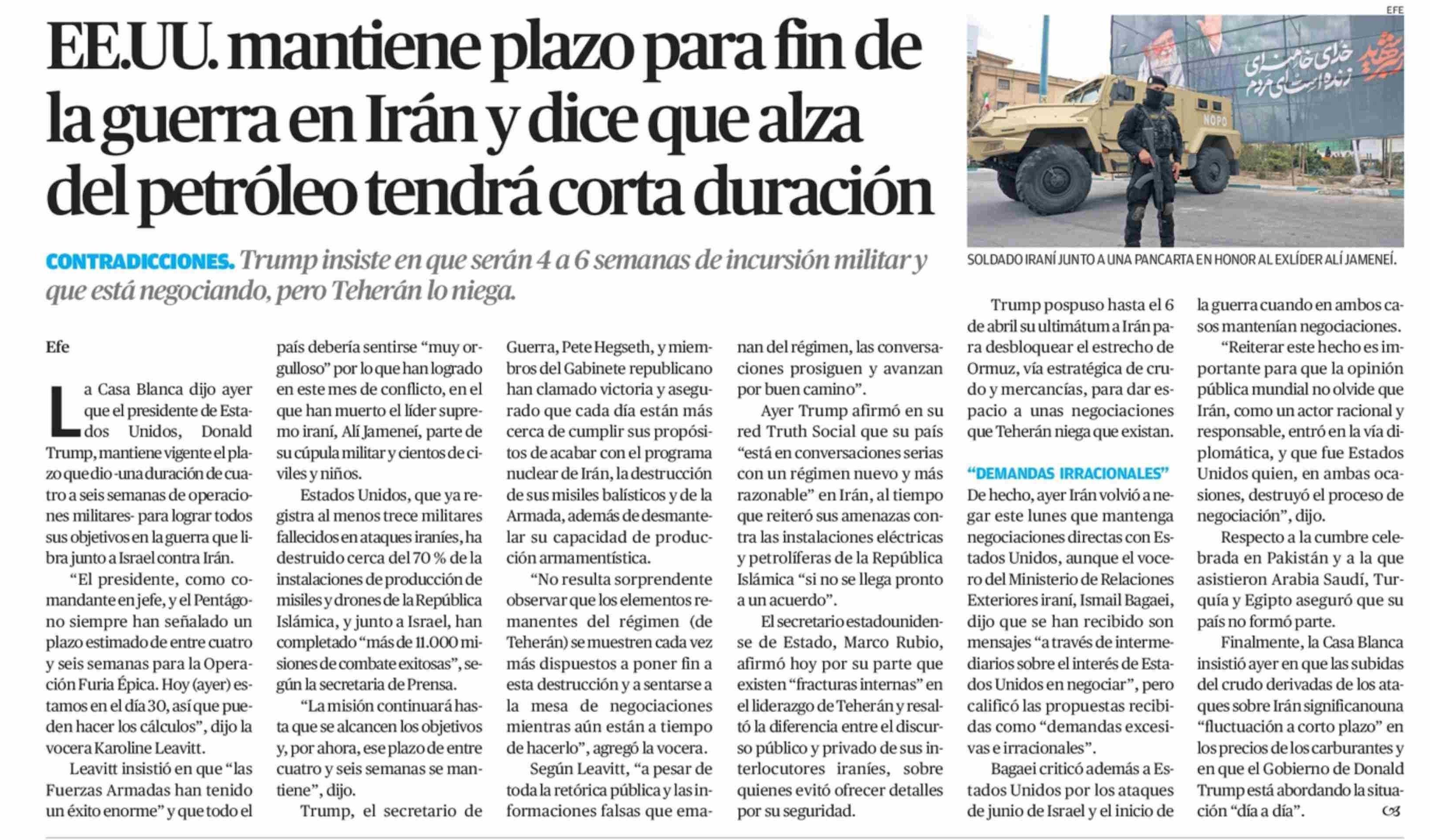 EEUU. mantiene plazo para fin de la guerra en Irán y dice que alza del petróleo tendrá corta duración