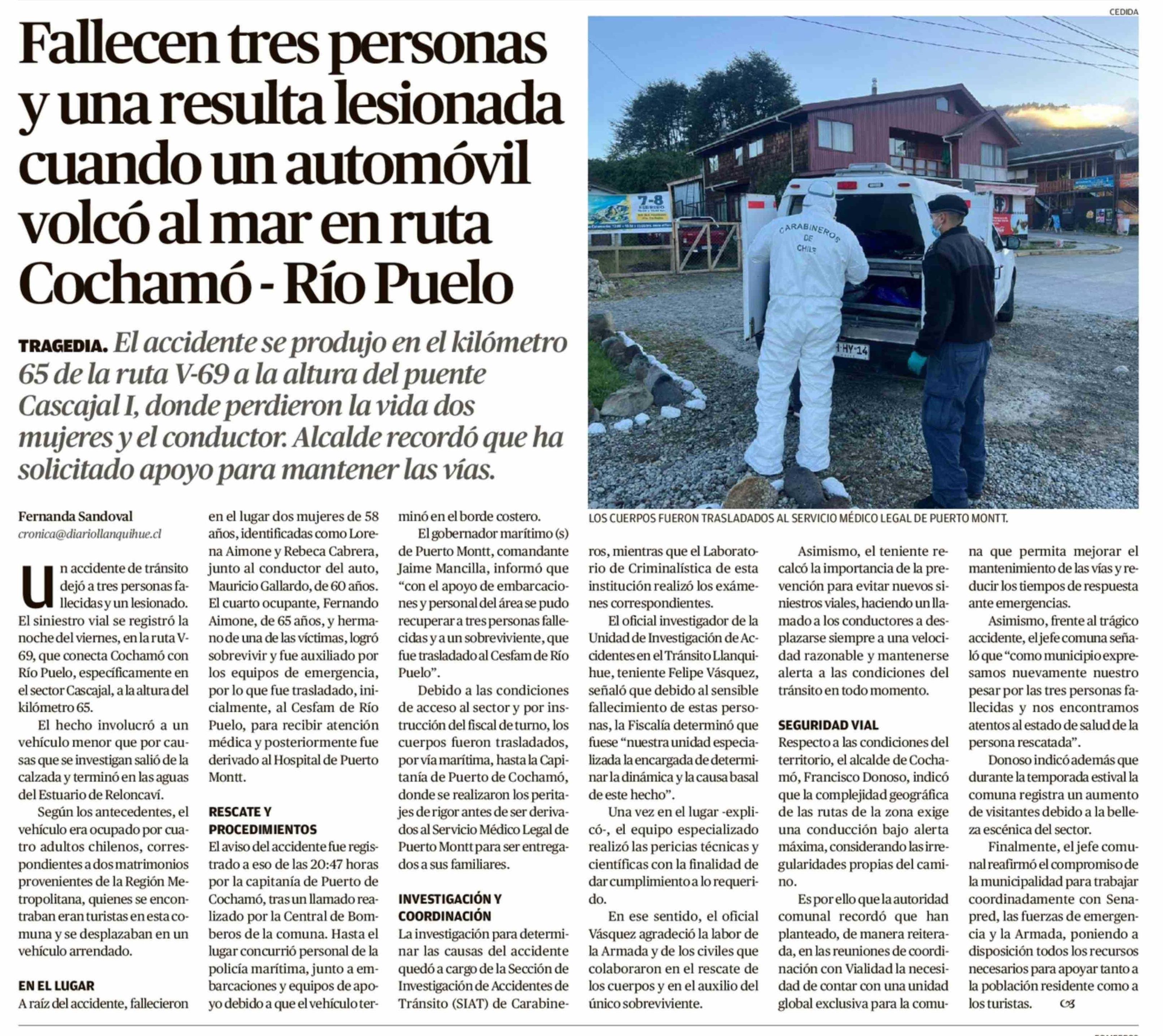 Fallecen tres personas y una resulta lesionada cuando un automóvil volcó al mar en ruta Cochamó - Río Puelo