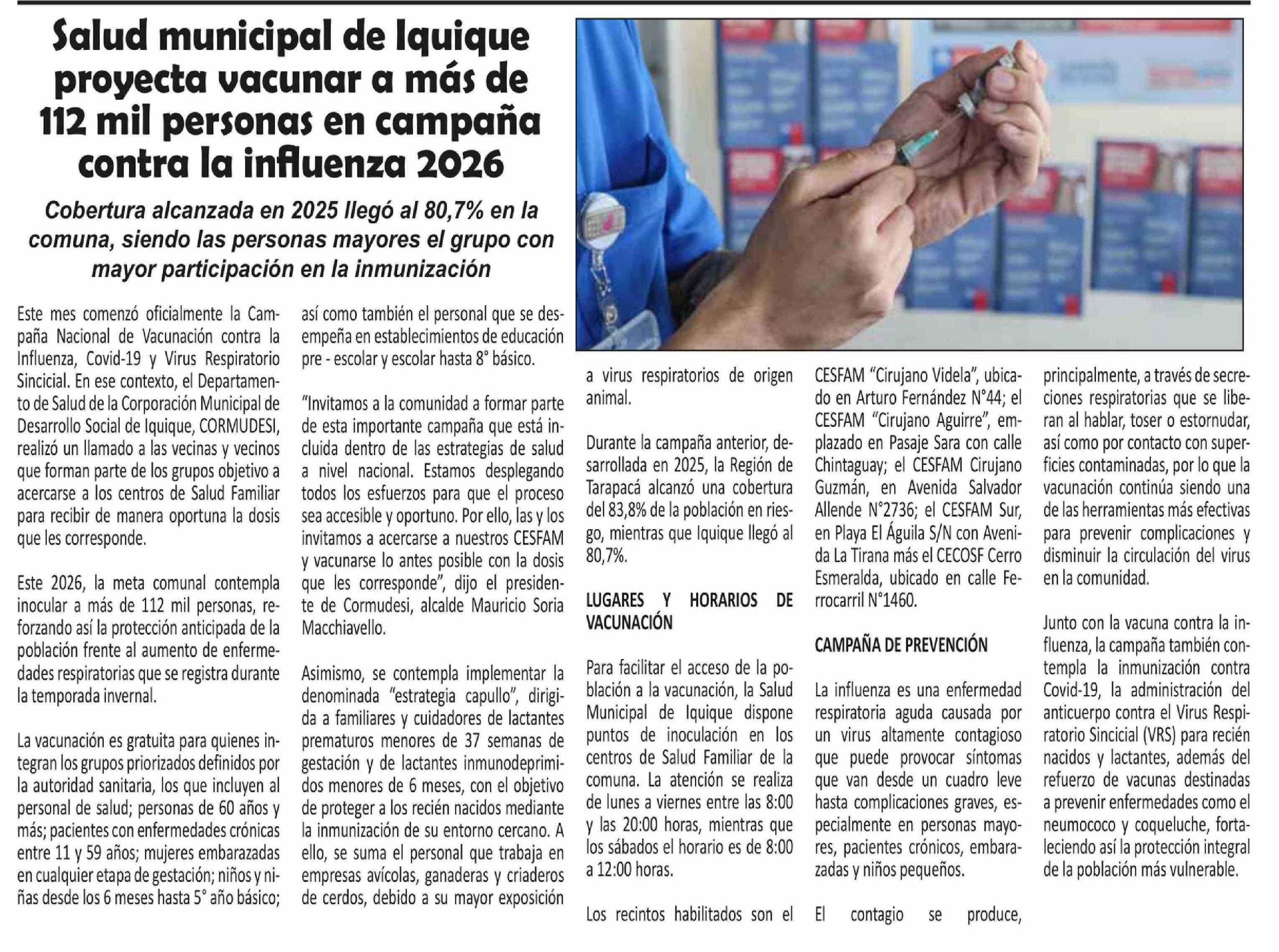Salud municipal de Iquique proyecta vacunar a más de 112 mil personas en campaña contra la influenza 2026