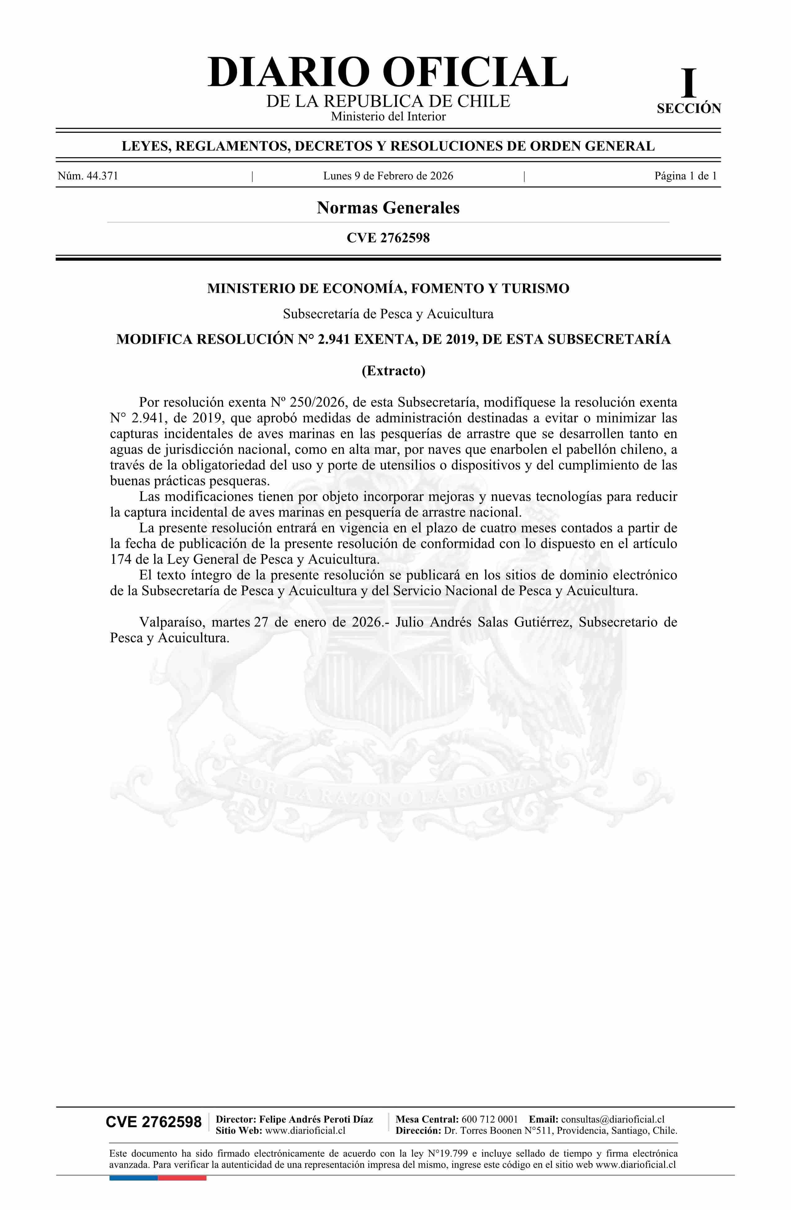 | Título: | Extracto de resolución exenta número 250, de 2026.- Modifica resolución N° 2.941 exenta, de 2019 |