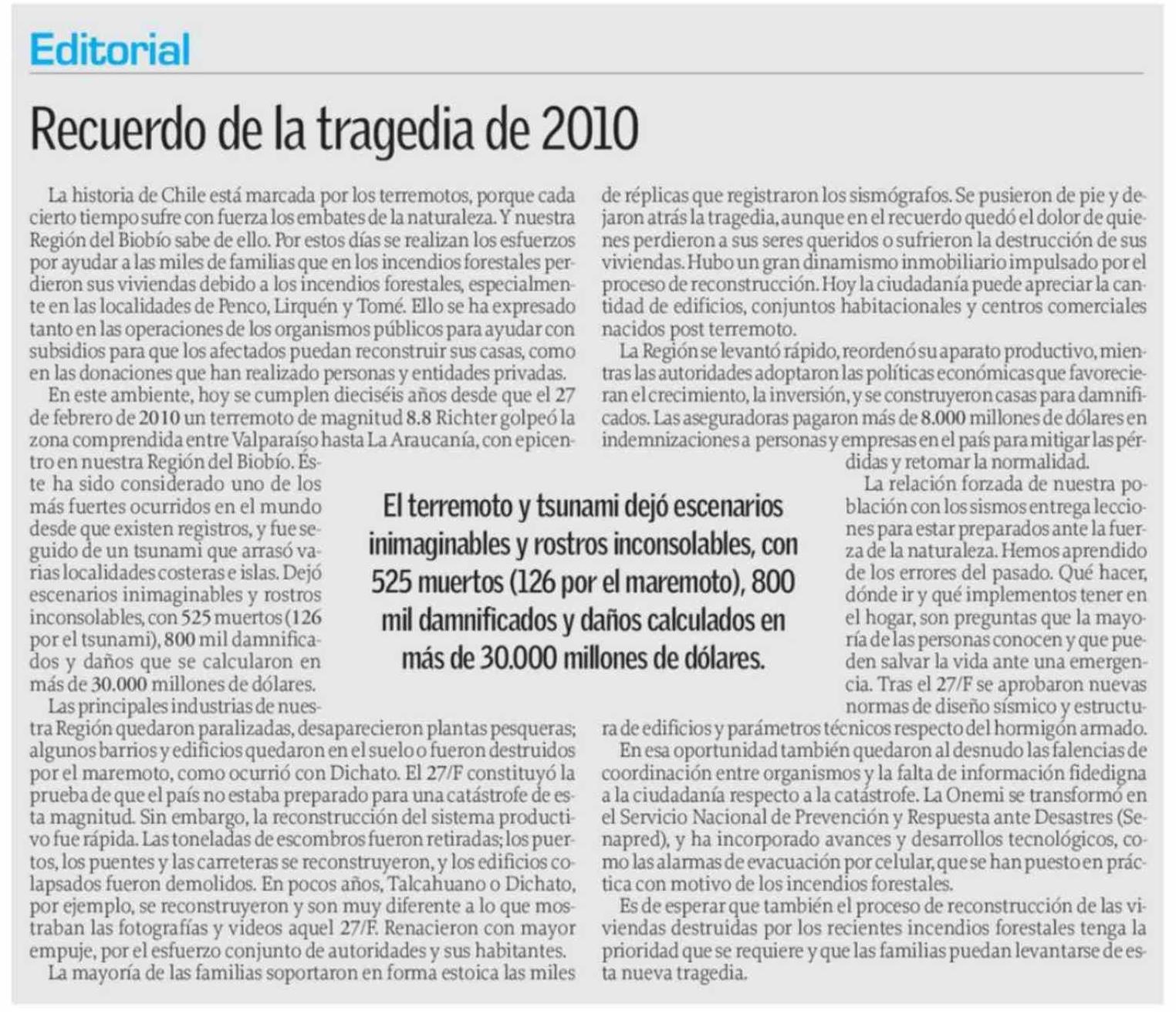 Editorial: Recuerdo de la tragedia de 2010