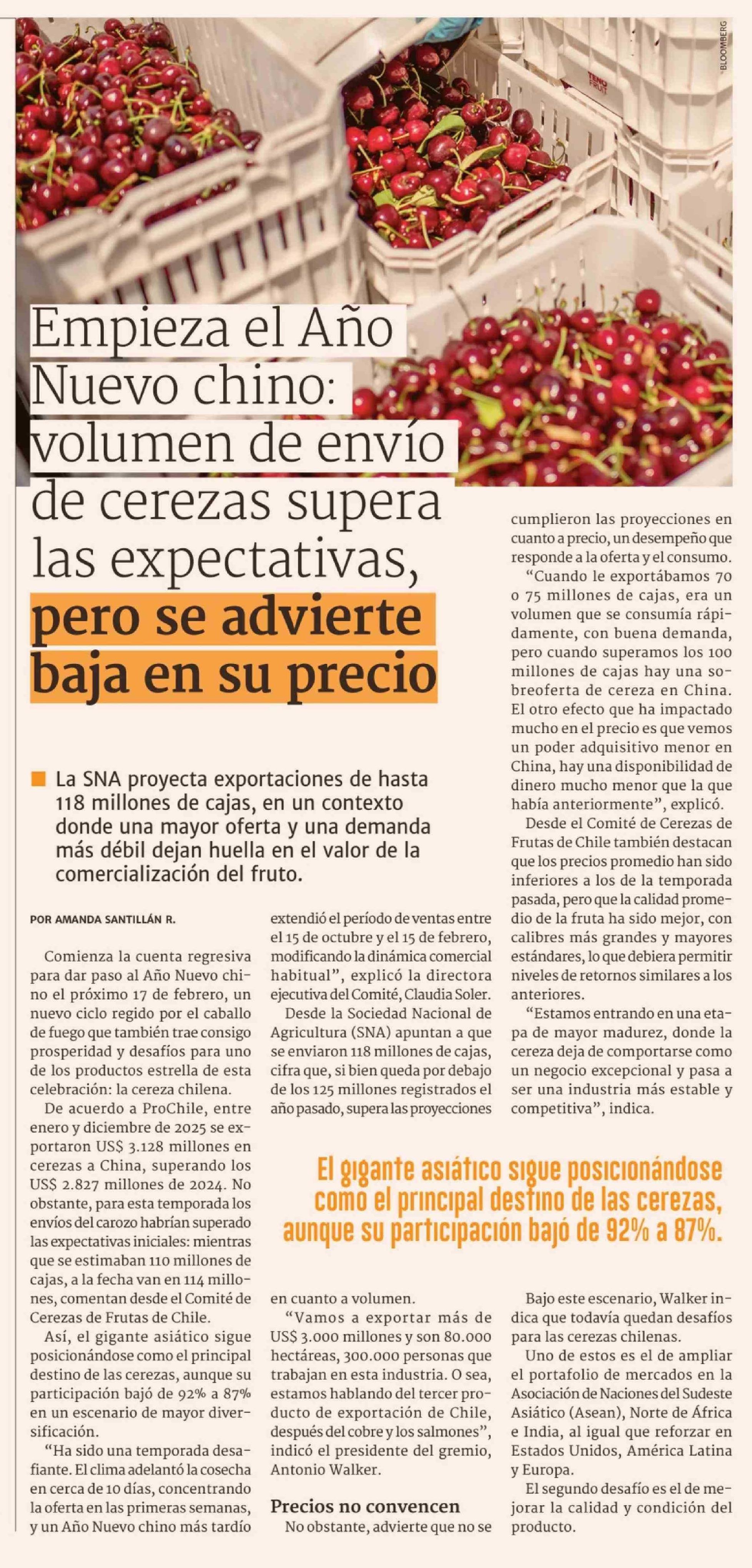 Empieza el Año Nuevo chino: volumen de envío de cerezas supera las expectativas, pero se advierte baja en su precio