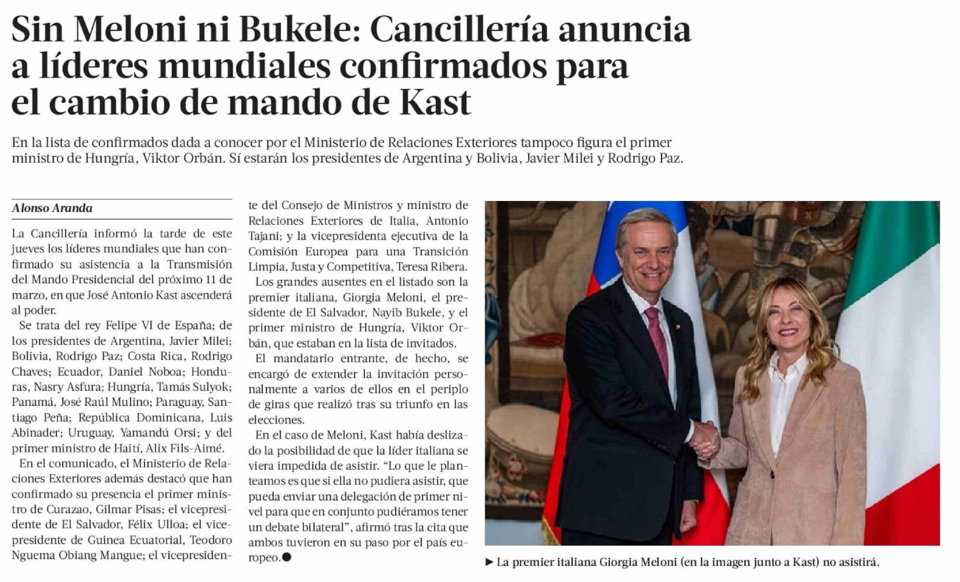 Sin Meloni ni Bukele: Cancillería anuncia a líderes mundiales confirmados para el cambio de mando de Kast