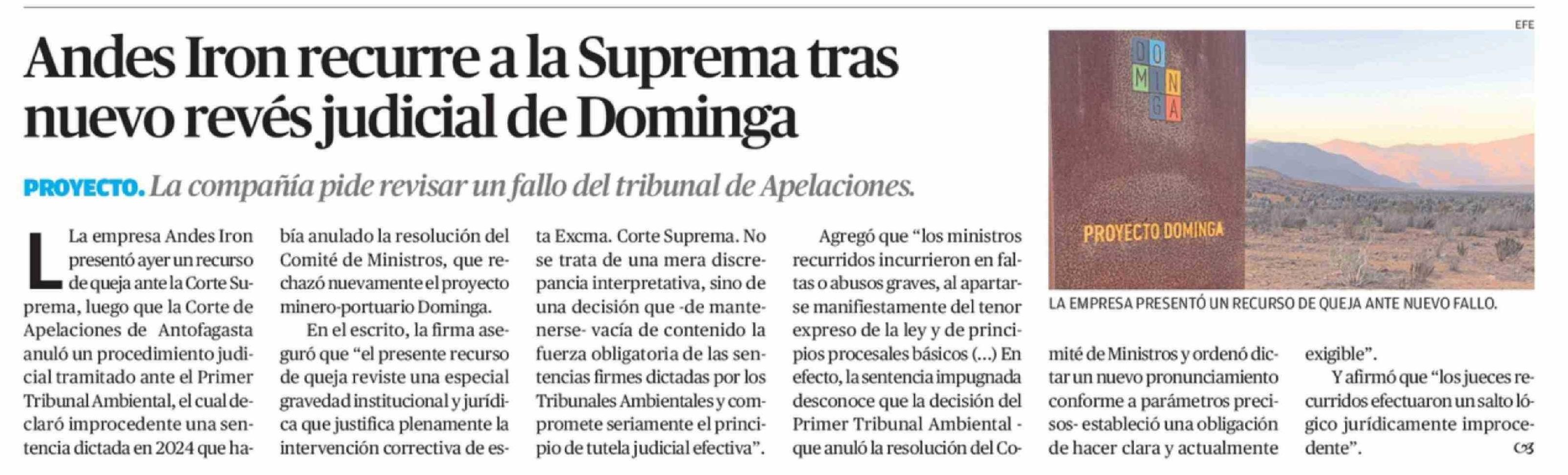 Título: Andes Iron recurre a la Suprema tras nuevo revés judicial de Dominga