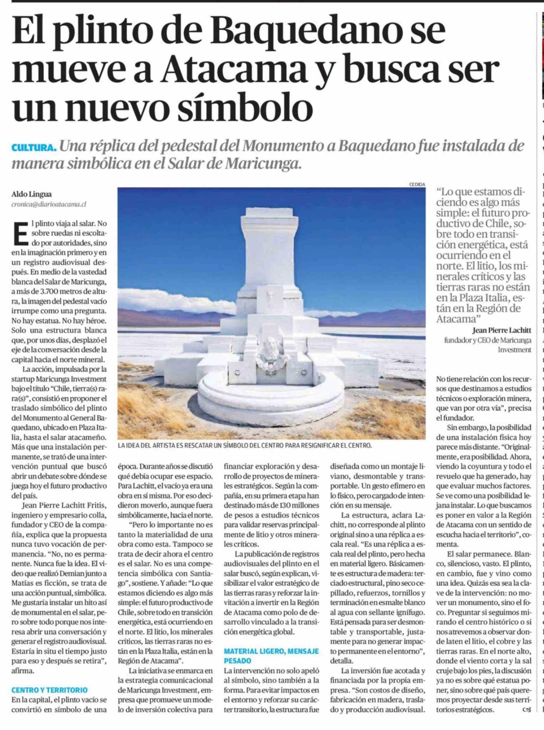 El plinto de Baquedano se mueve a Atacama y busca ser un nuevo símbolo