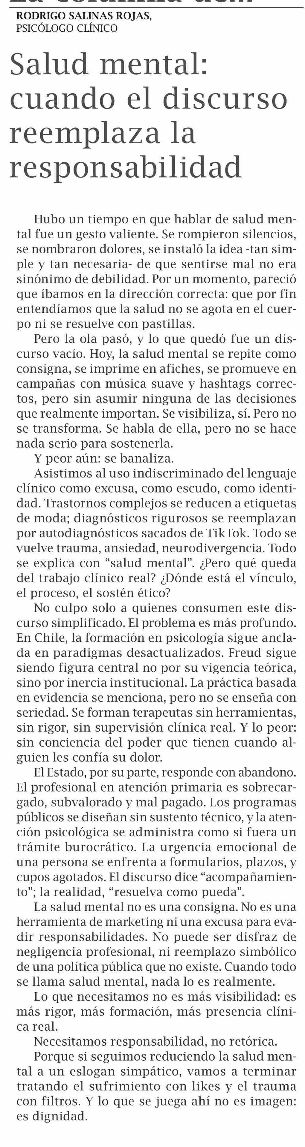 Columnas de Opinión: Salud mental: cuando el discurso reemplaza la responsabilidad