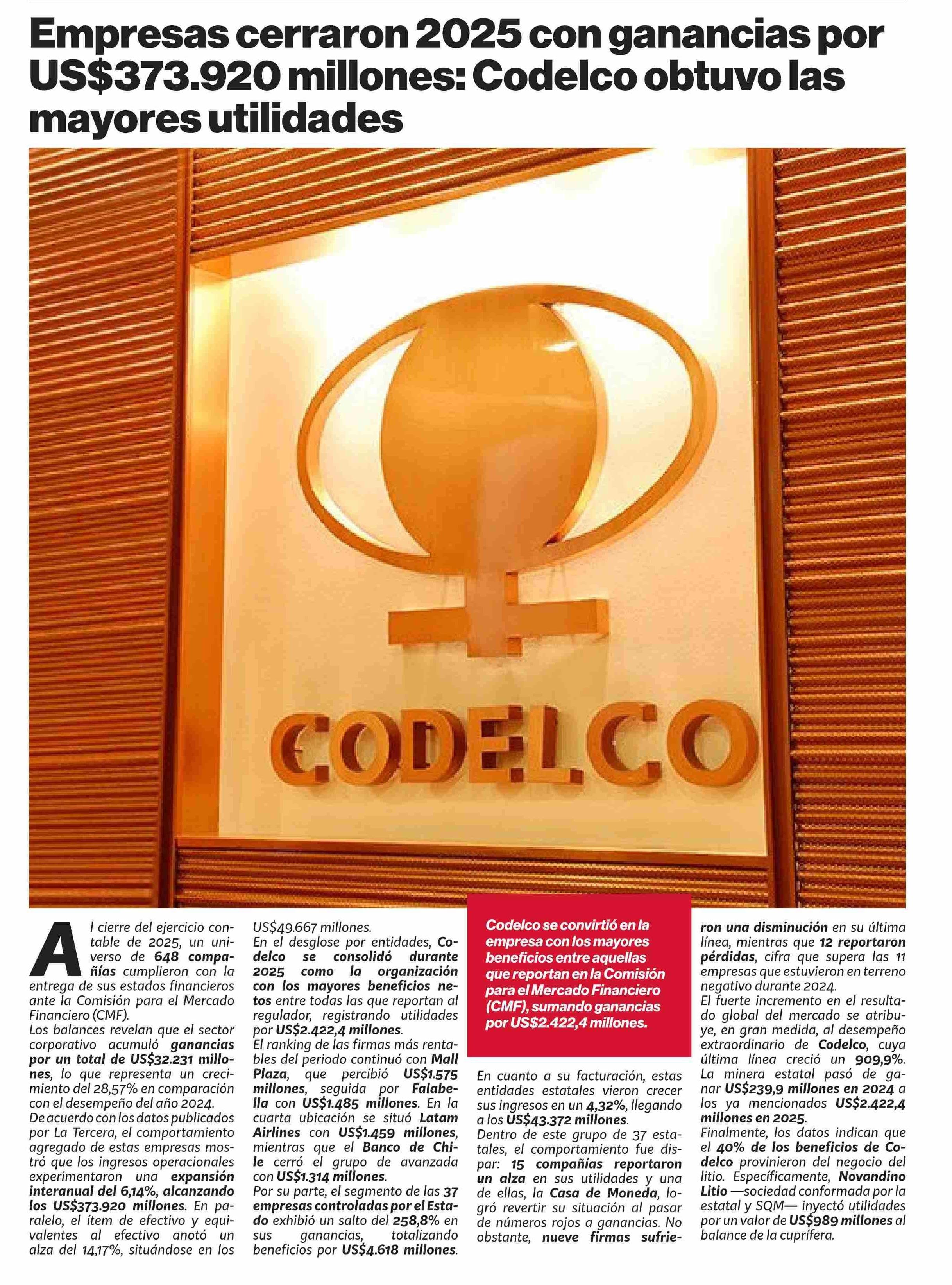 Empresas cerraron 2025 con ganancias por US$373.920 millones: Codelco obtuvo las mayores utilidades