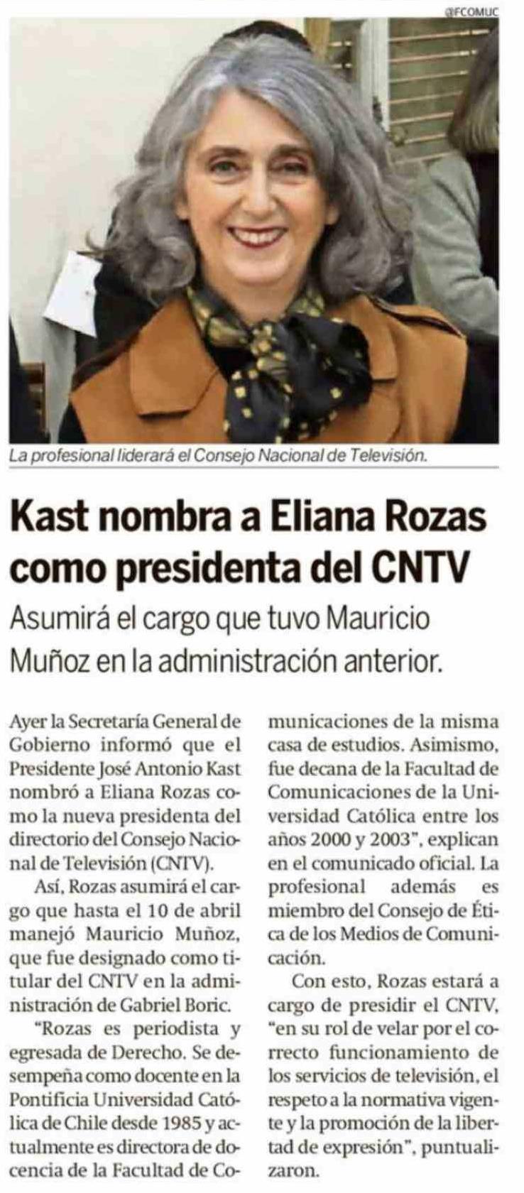 Kast nombra a Eliana Rozas como presidenta del CNTV