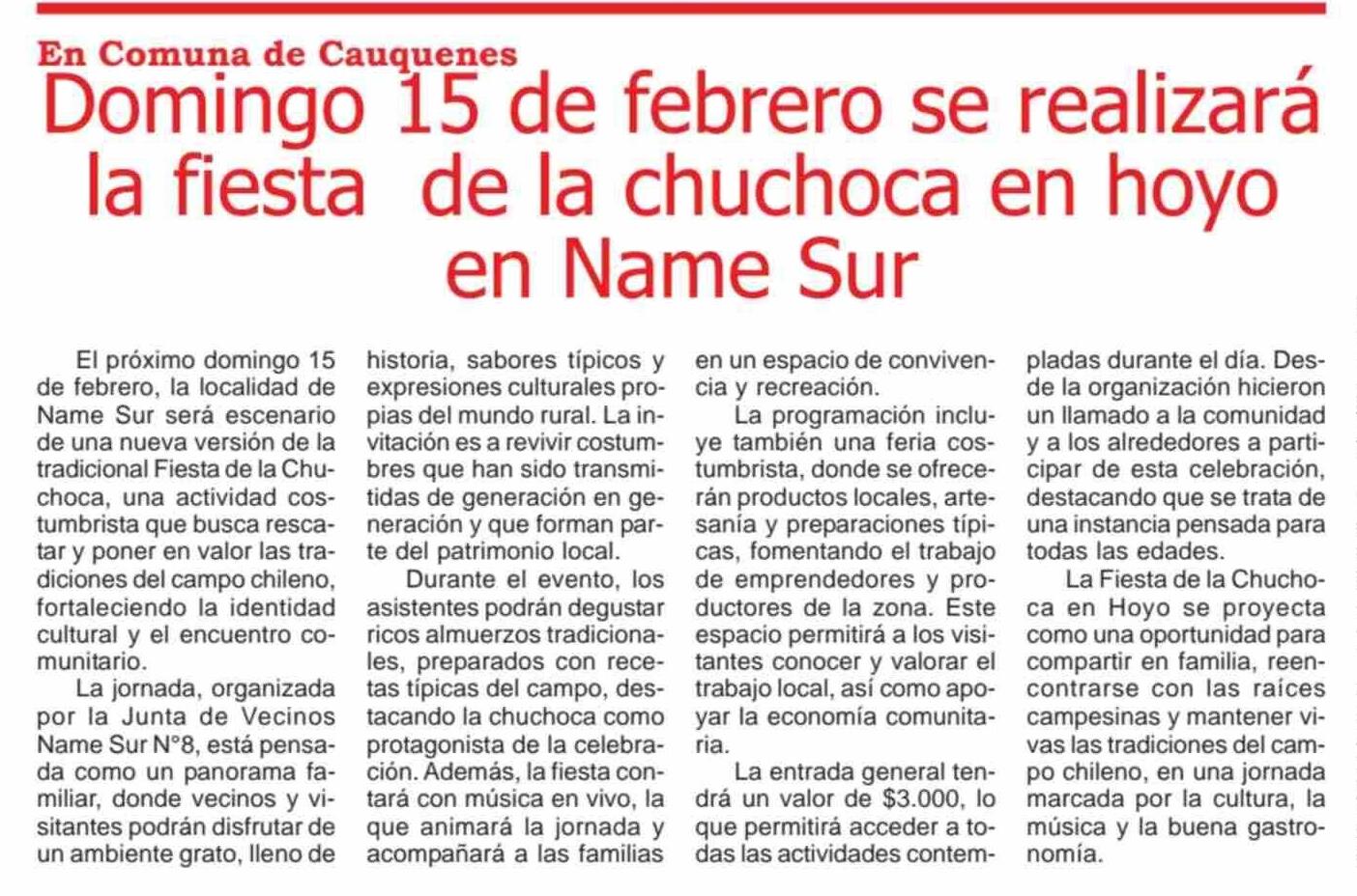 Domingo 15 de febrero se realizará la fiesta de la chuchoca en hoyo en Name Sur