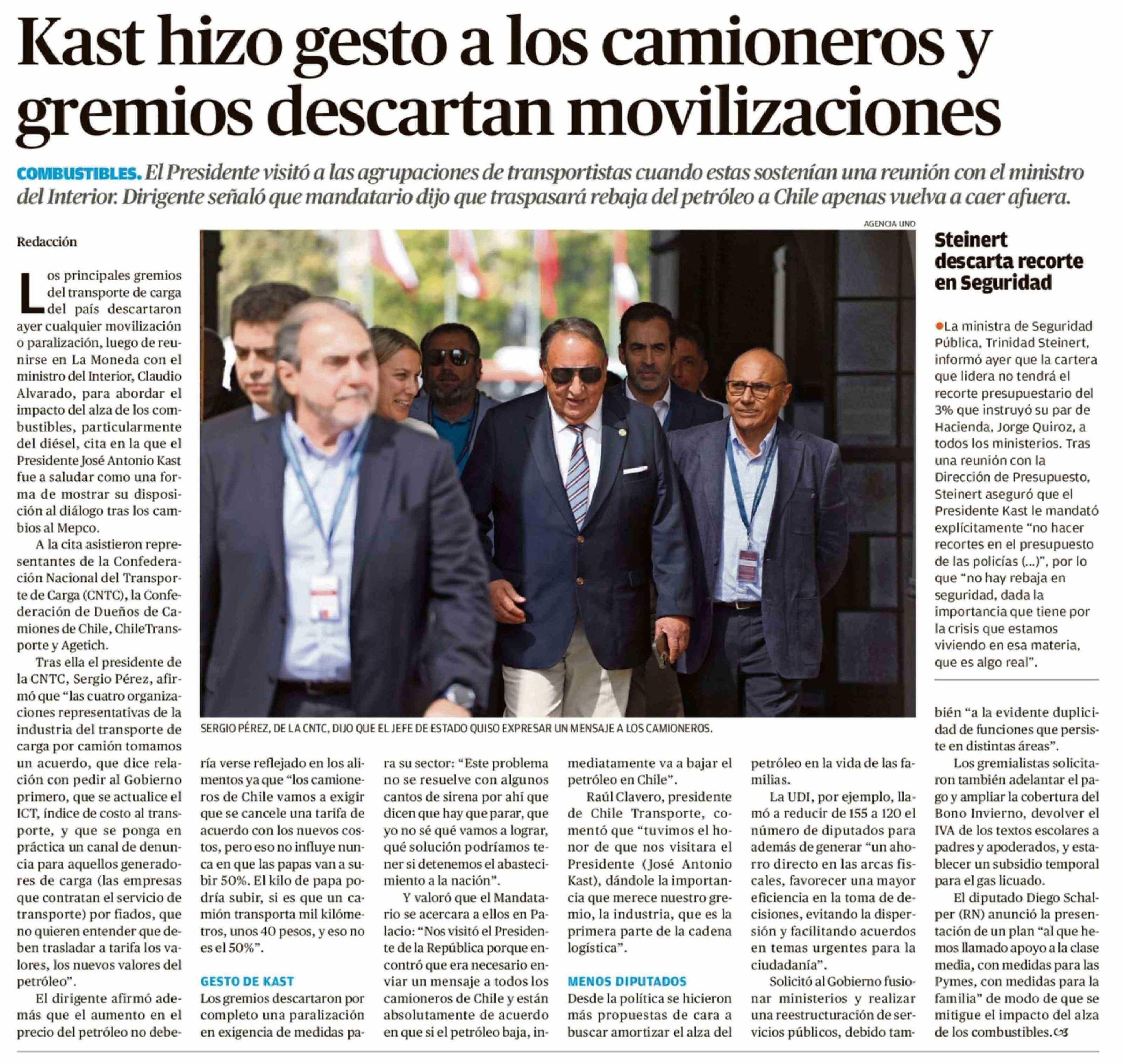 Kast hizo gesto a los camioneros y gremios descartan movilizaciones