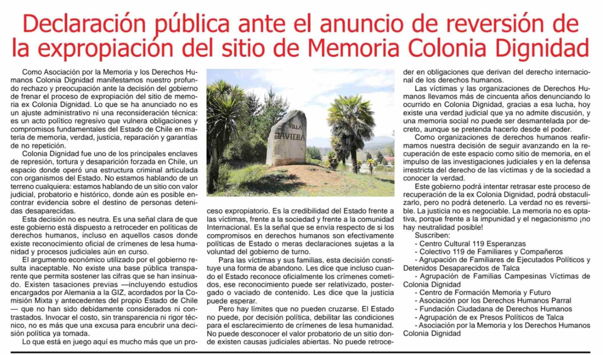 Declaración pública ante el anuncio de reversión de la expropiación del sitio de Memoria Colonia Dignidad