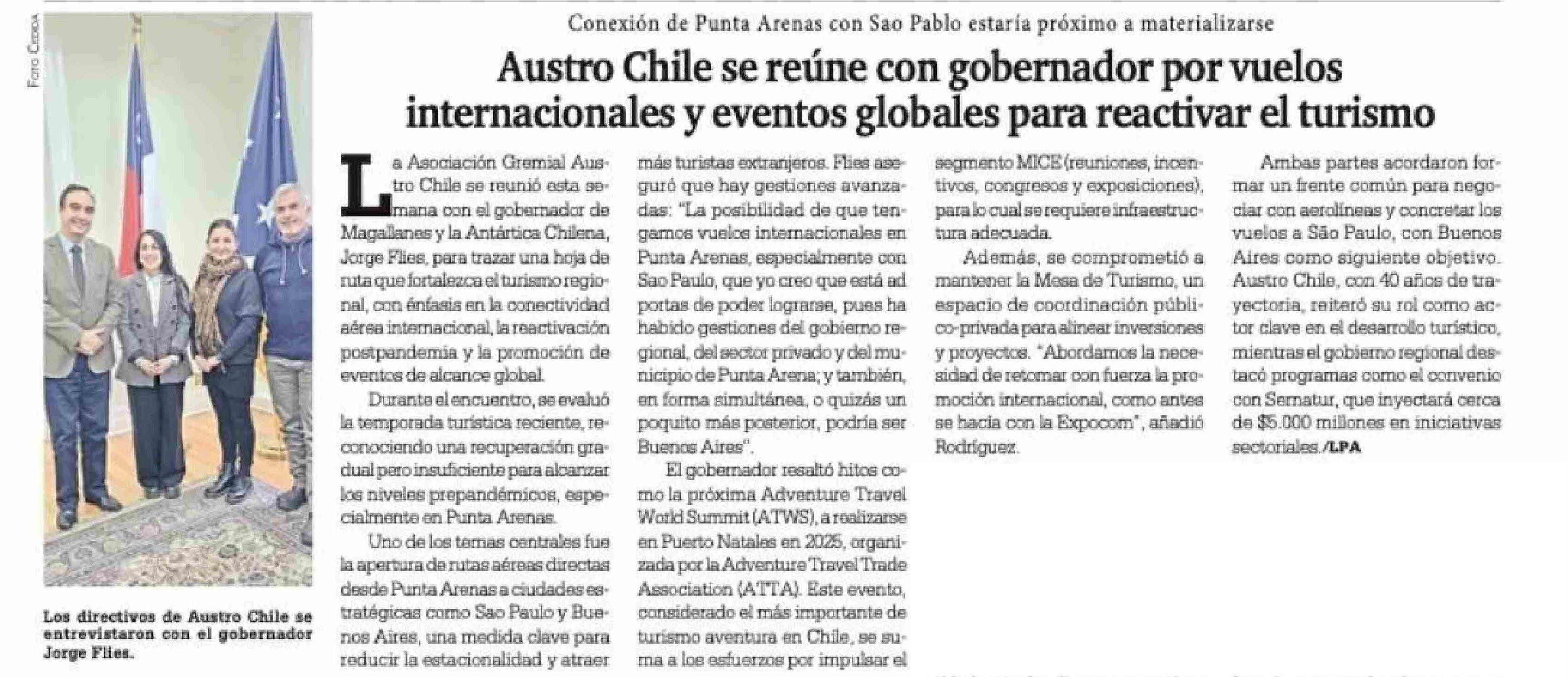 Austro Chile se reúne con gobernador por vuelos internacionales y eventos globales para reactivar el turismo