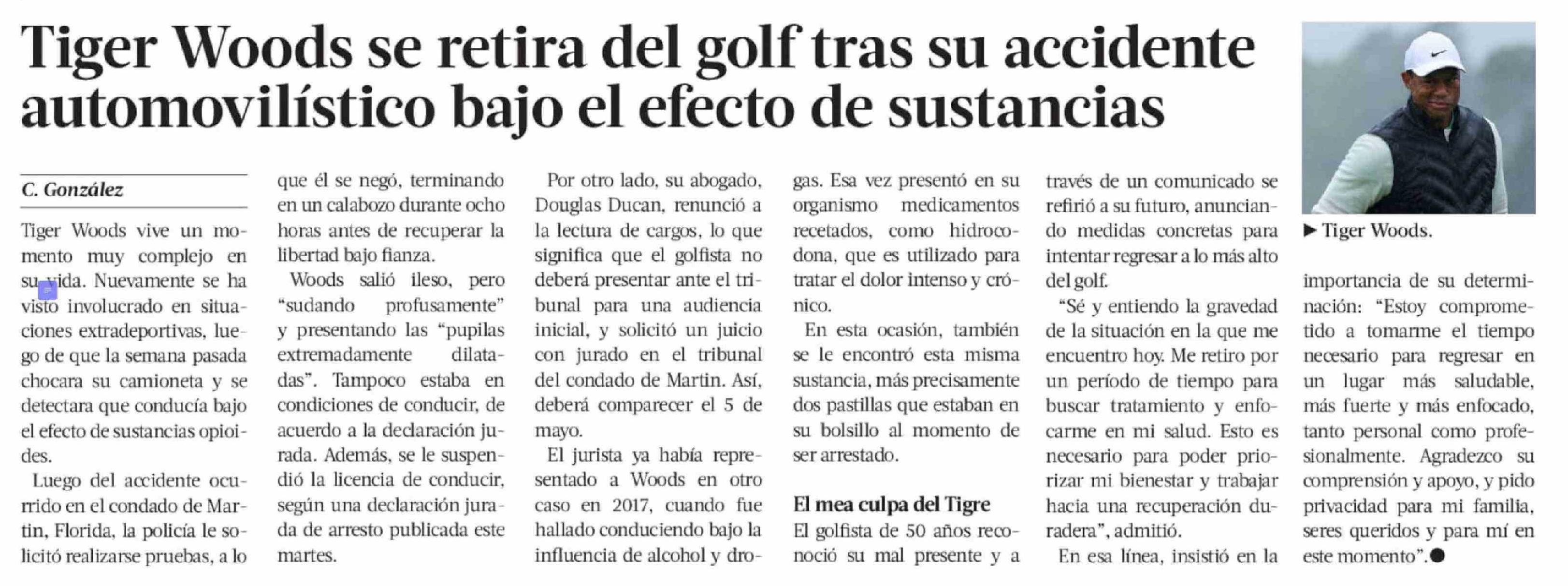 Título: Tiger Woods se retira del golf tras su accidente automovilístico bajo el efecto de sustancias