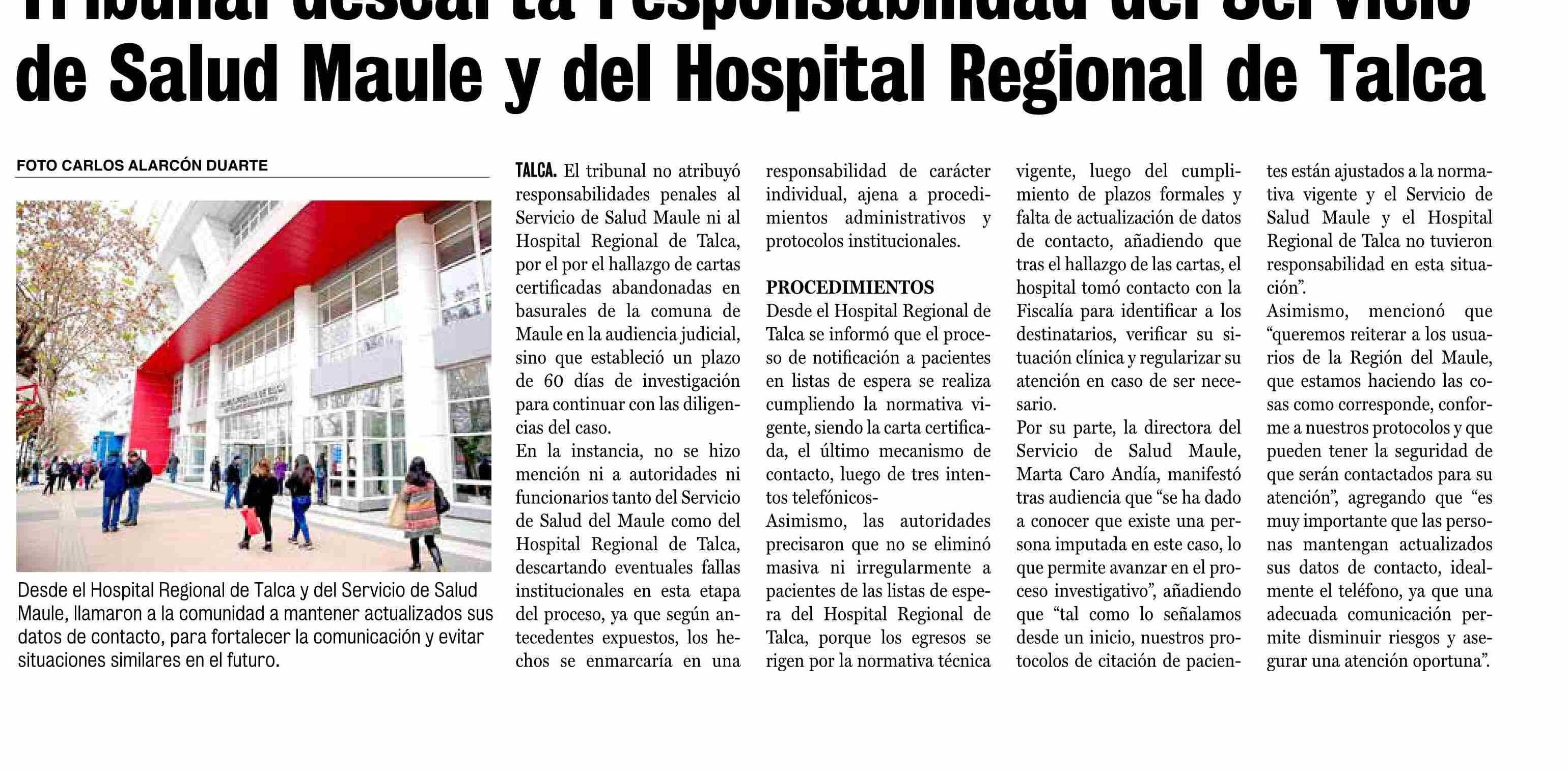 Tribunal descarta responsabilidad del Servicio de Salud Maule y del Hospital Regional de Talca