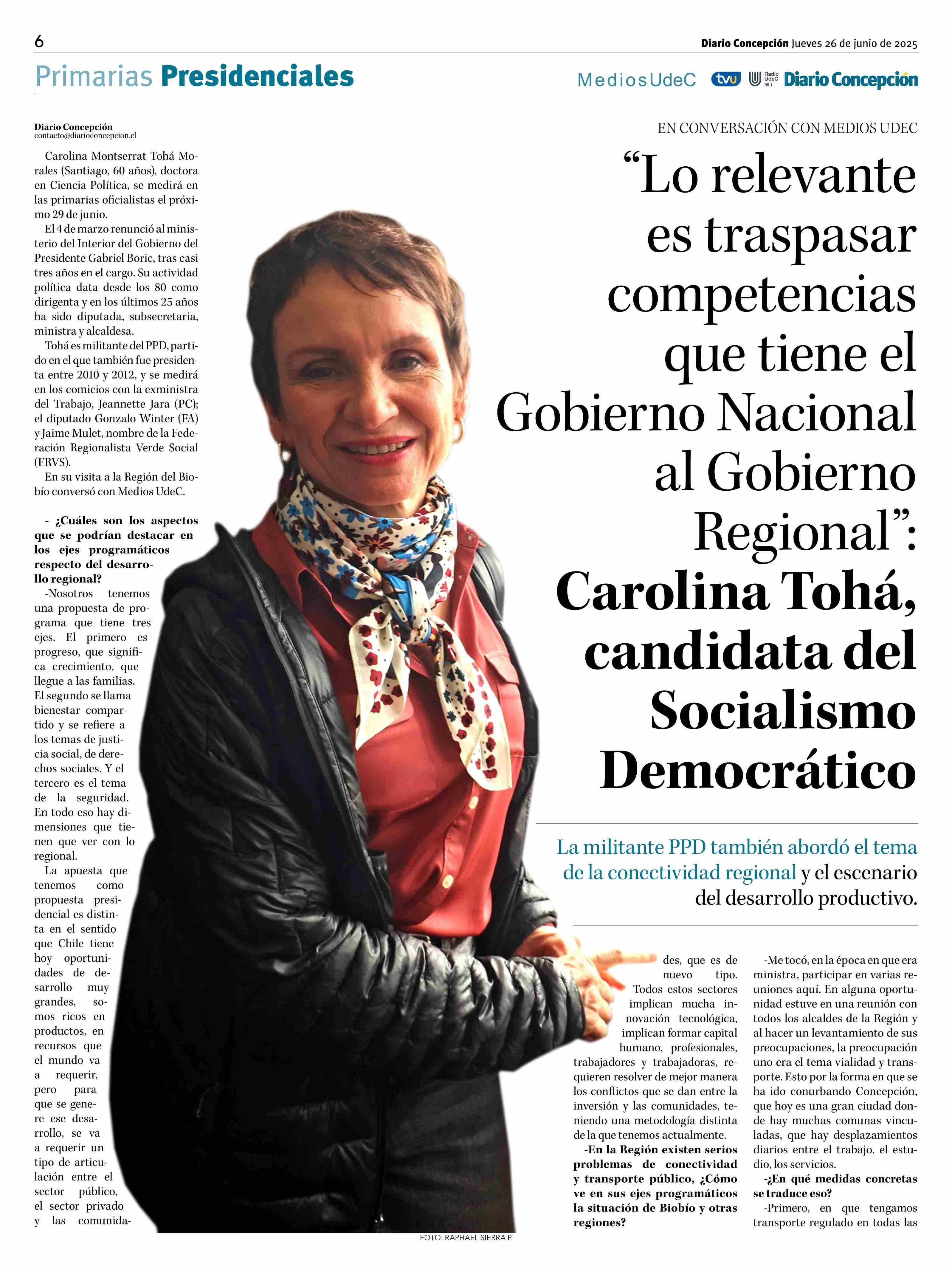 | Título: | “Lo relevante es traspasar competencias | que tiene el Gobierno Nacional al Gobierno Regional” Carolina Tohá, candidata del Socialismo Democrático |
