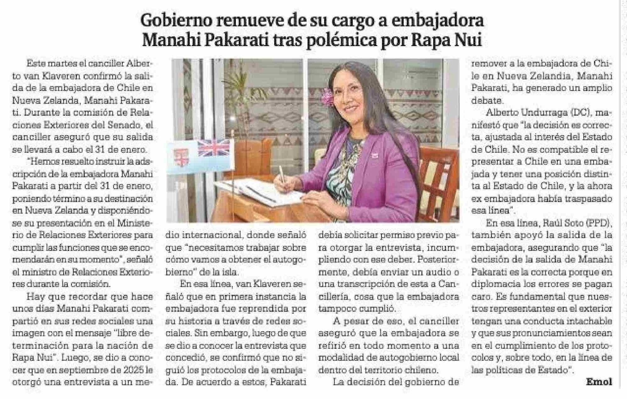 Gobierno remueve de su cargo a embajadora Manahi Pakarati tras polémica por Rapa Nui