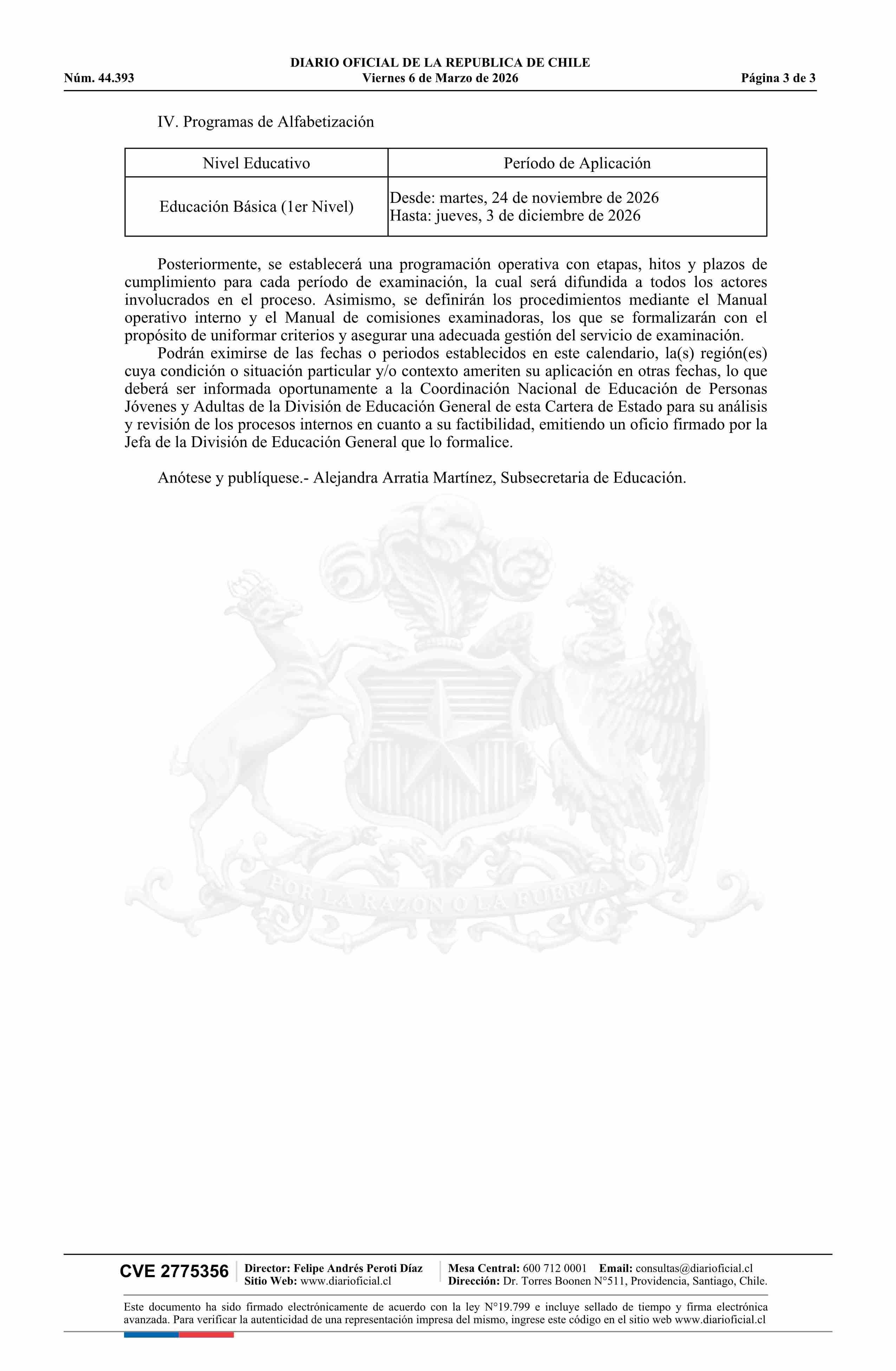| Título: | Resolución exenta número 814, de 2026.- Fija para el año 2026 el calendario nacional de examinación para los Niveles de Educación Básica y Media para Adultos |