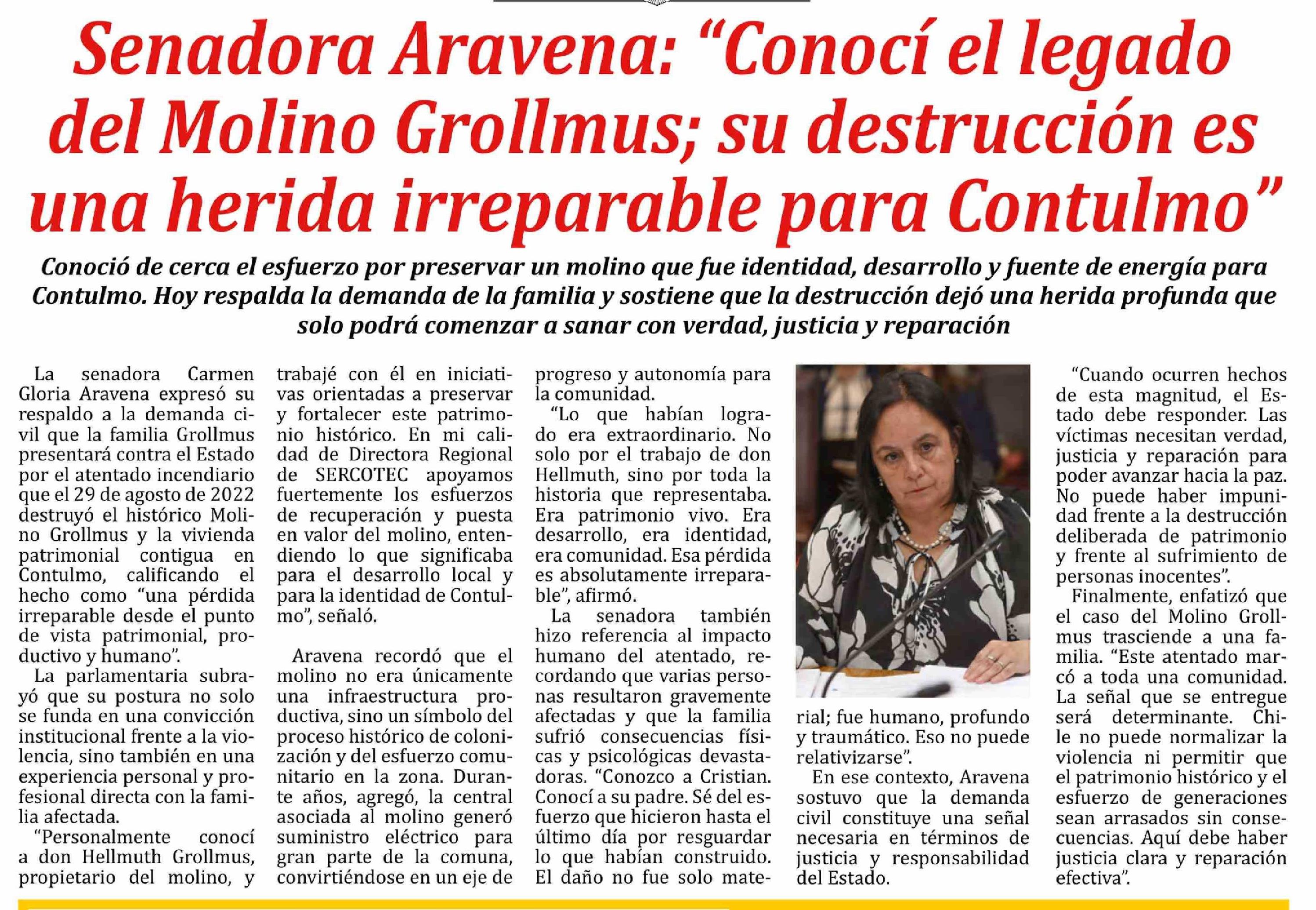 Senadora Aravena: "Conocí el legado del Molino Grollmus; su destrucción es una herida irreparable para Contulmo"