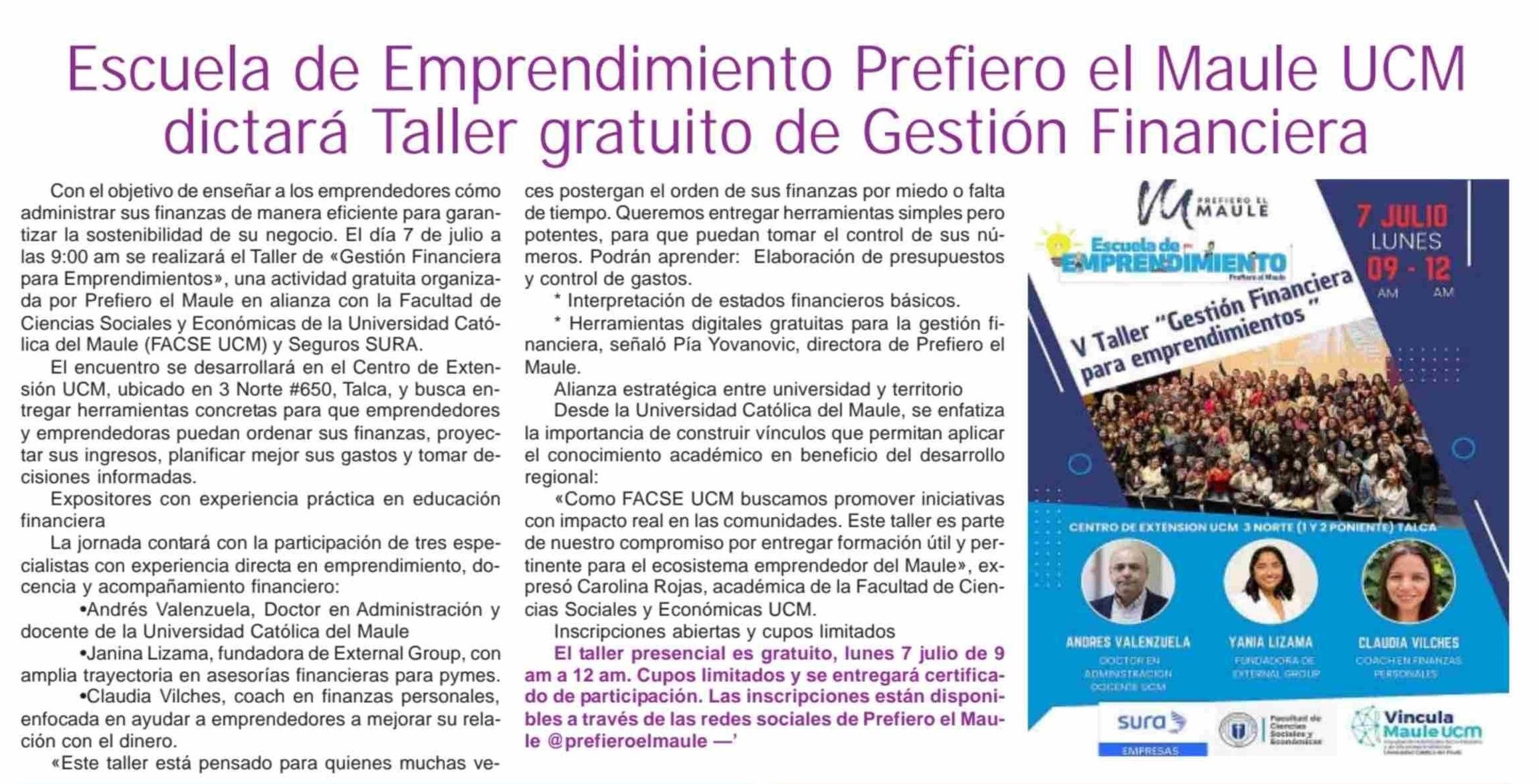 Escuela de Emprendimiento Prefiero el Maule UCM dictará Taller gratuito de Gestión Financiera