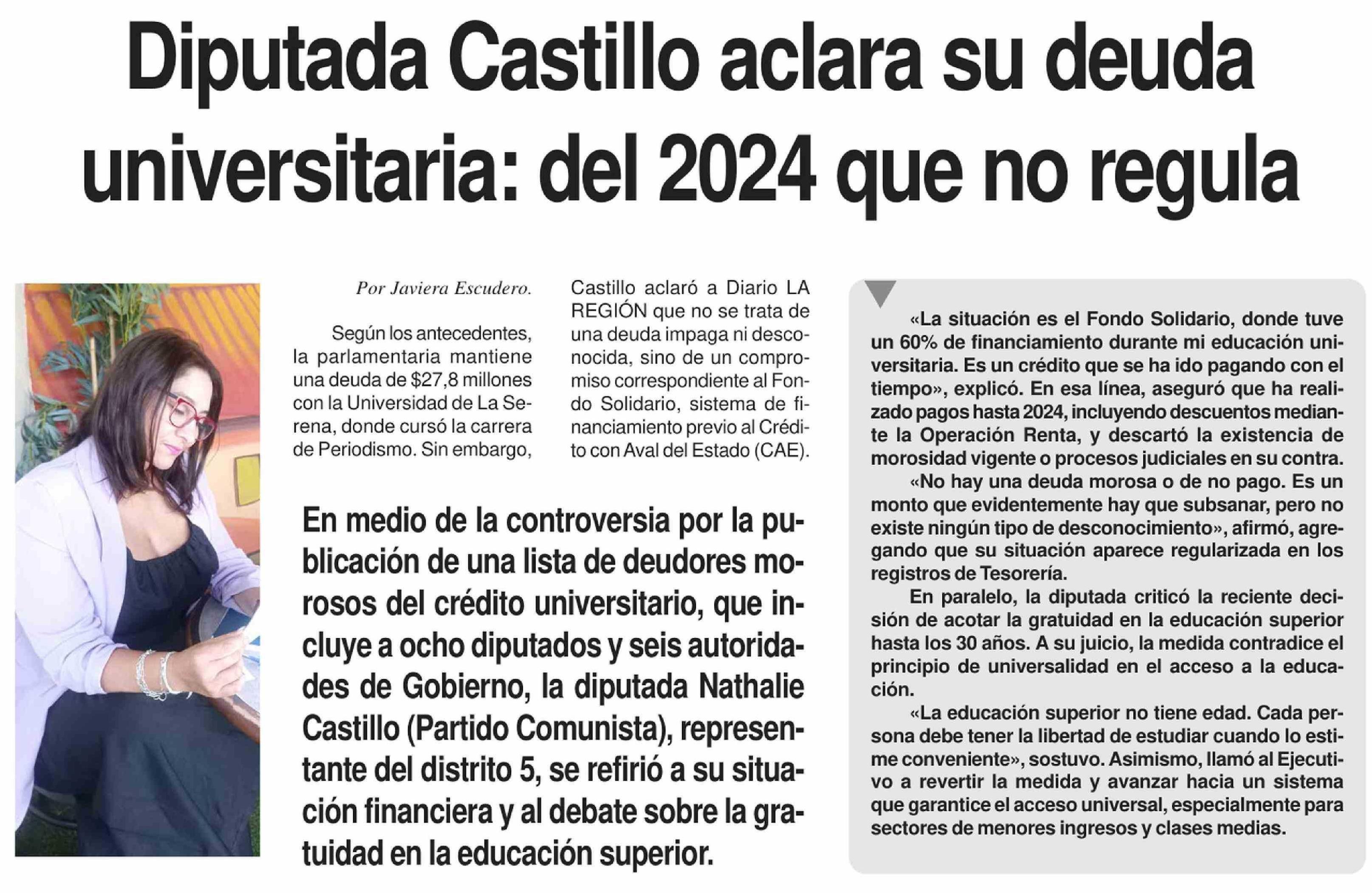 Diputada Castillo aclara su deuda universitaria: del 2024 que no regula