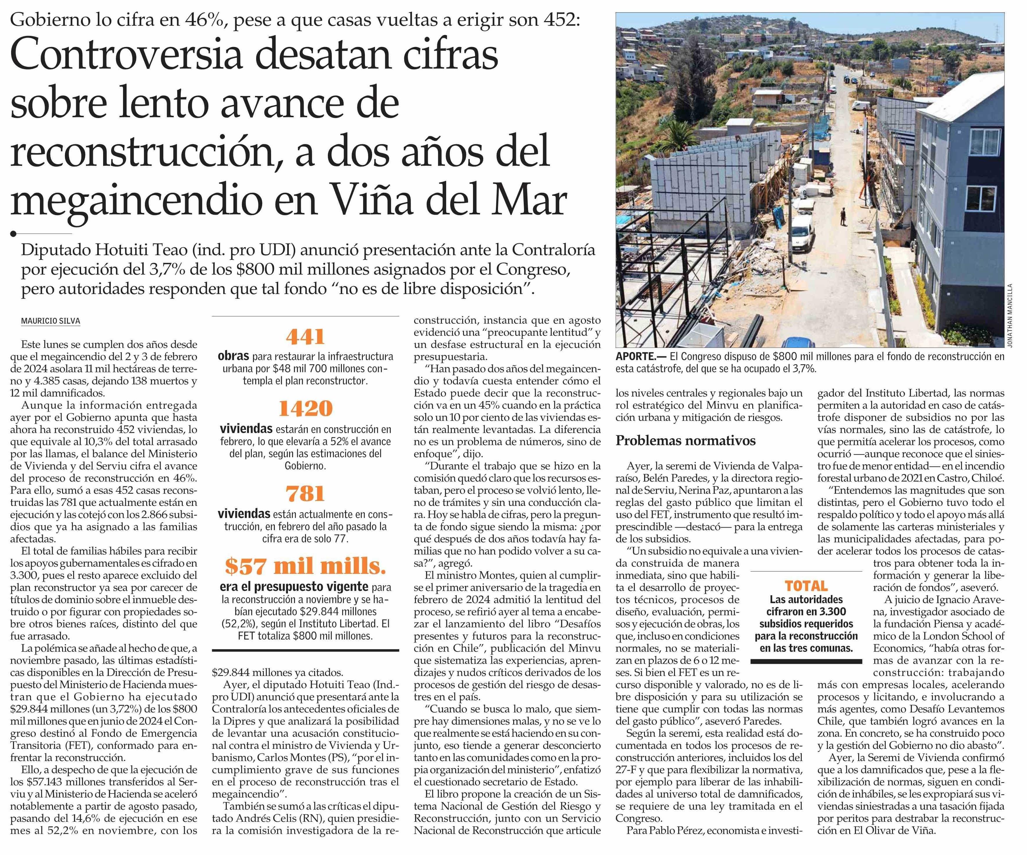 Controversia desatan cifras sobre lento avance de reconstrucción, a dos años del megaincendio en Viña del Mar