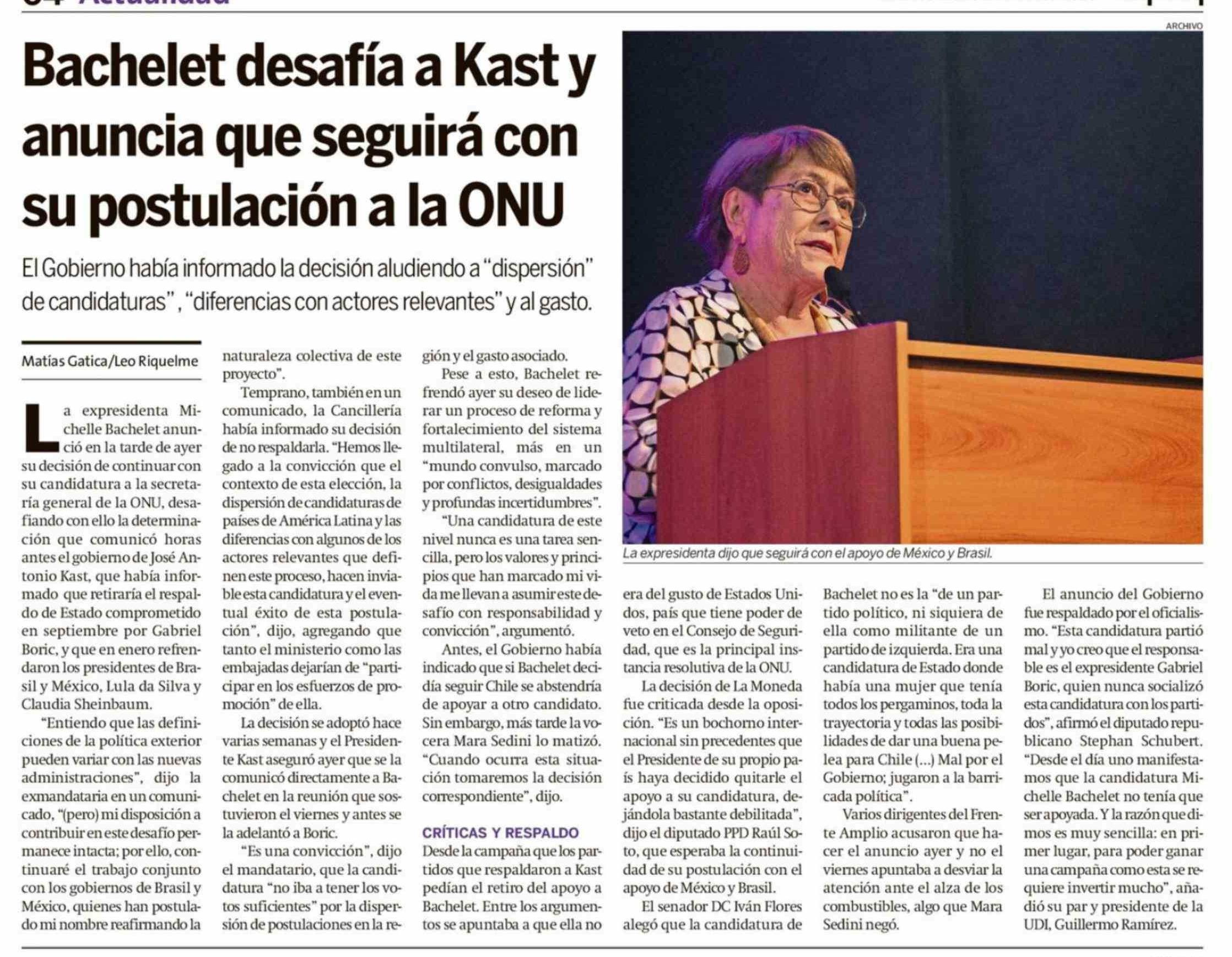 Bachelet desafía a Kast y anuncia que seguirá con su postulación a la ONU
