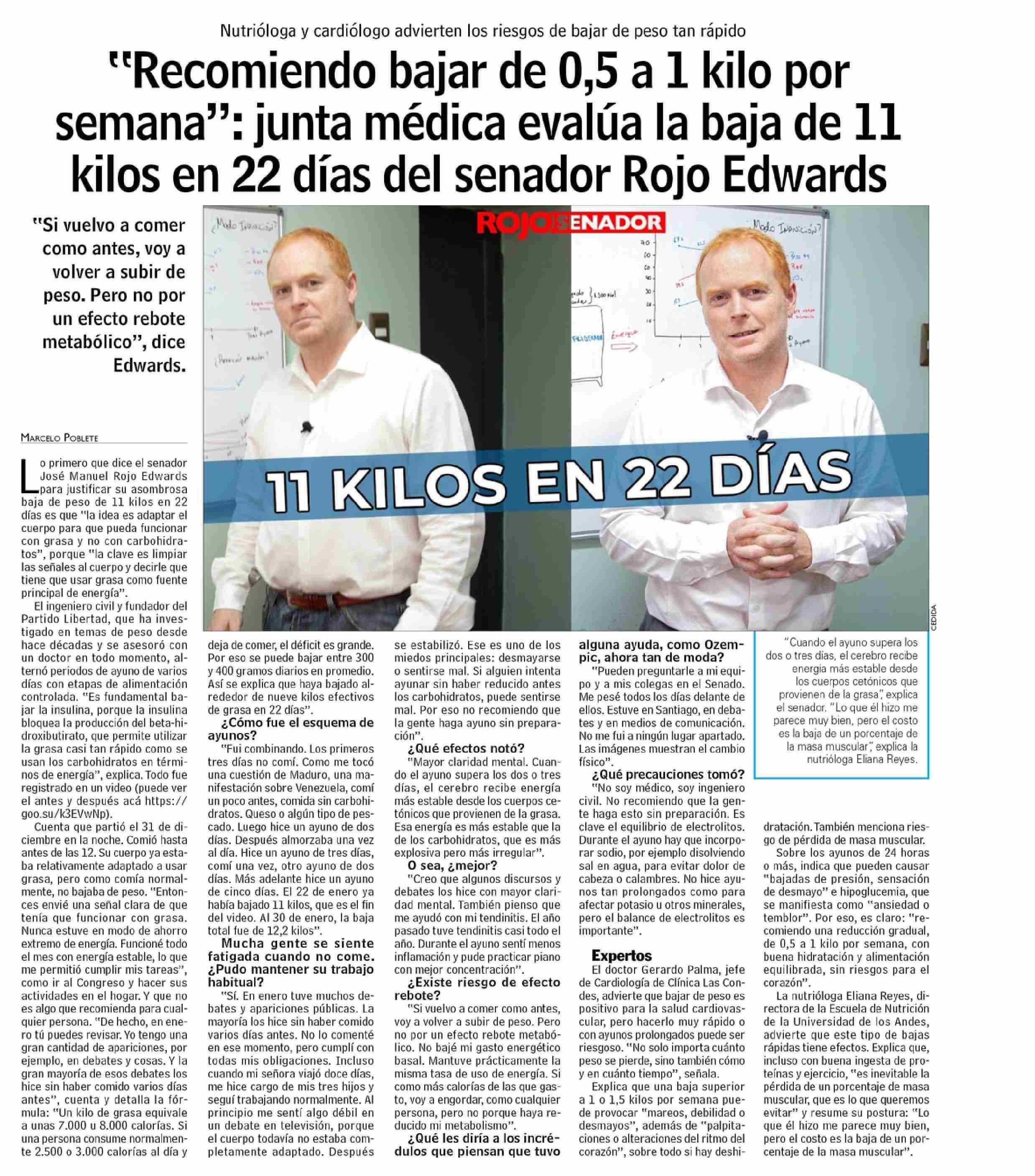 “Recomiendo bajar de 0,5 a 1 kilo por semana”: junta médica evalúa la baja de 11 kilos en 22 días del senador Rojo Edwards