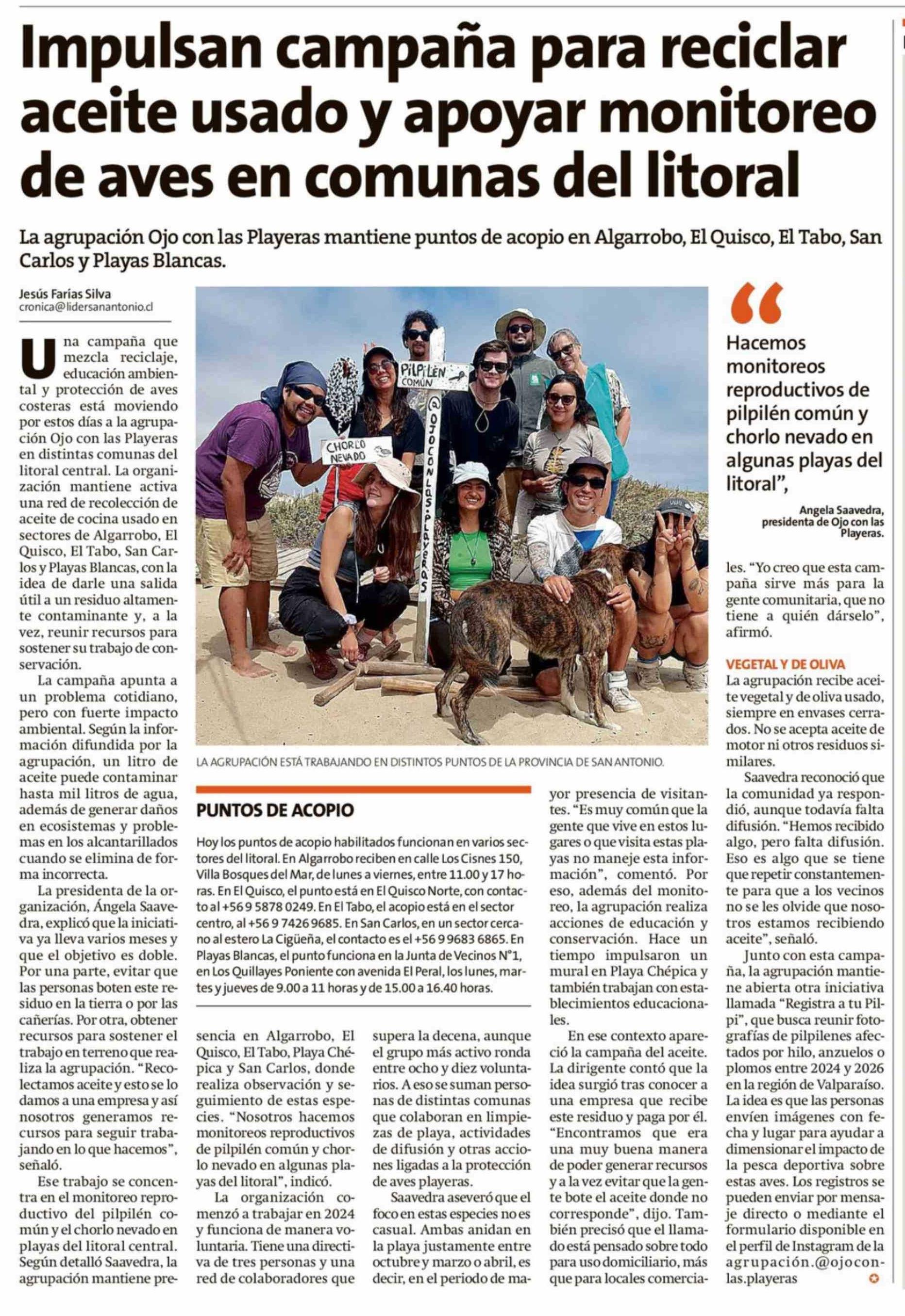 Impulsan campaña para reciclar aceite usado y apoyar monitoreo de aves en comunas del litoral