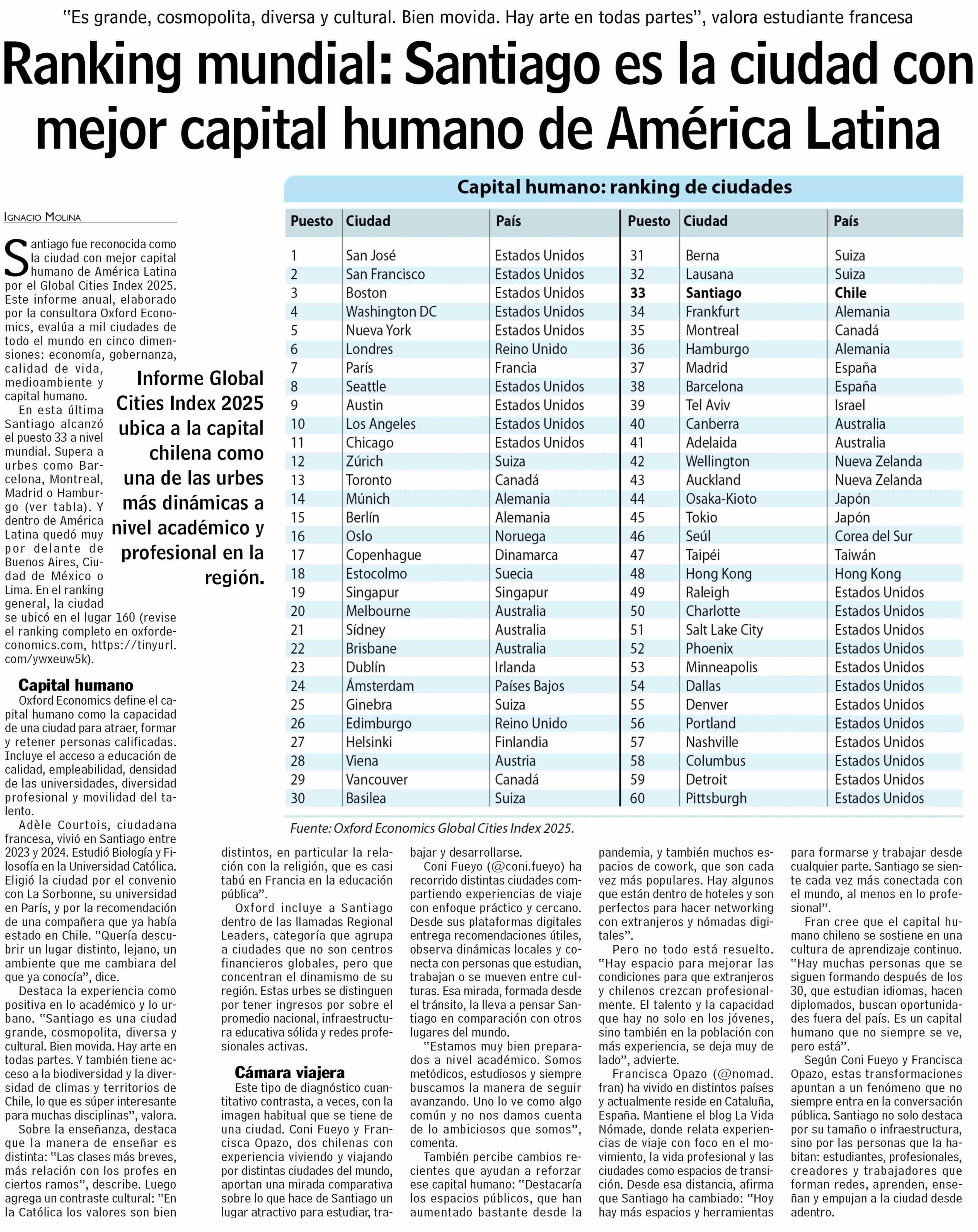 Ranking mundial: Santiago es la ciudad con mejor capital humano de América Latina