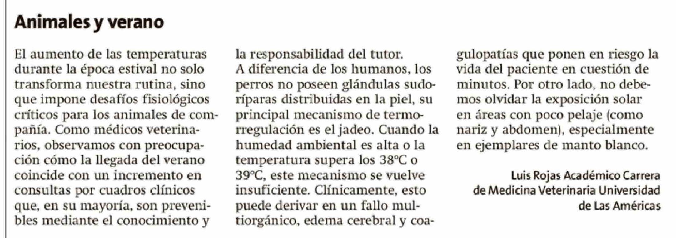 | Título: | Cartas: El aumento de las temperaturas durante la época estival no solo transforma nuestra rutina, sino que impone desafíos fisiológicos críticos para los animales de compañía. Como médicos veterinarios, observamos con preocupación cómo la llegada del verano coincide con un incremento en consultas p |