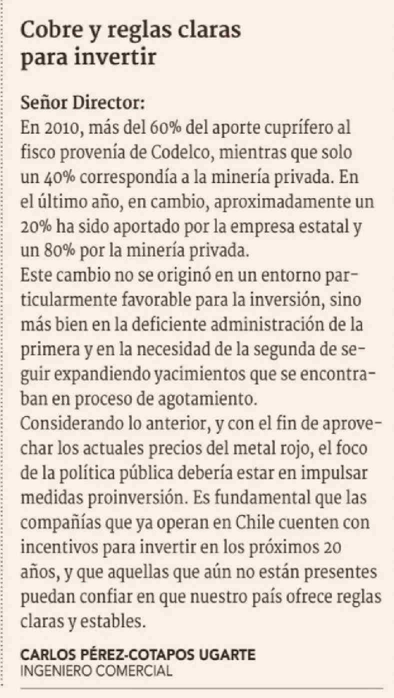 Cartas: Cobre y reglas claras para invertir