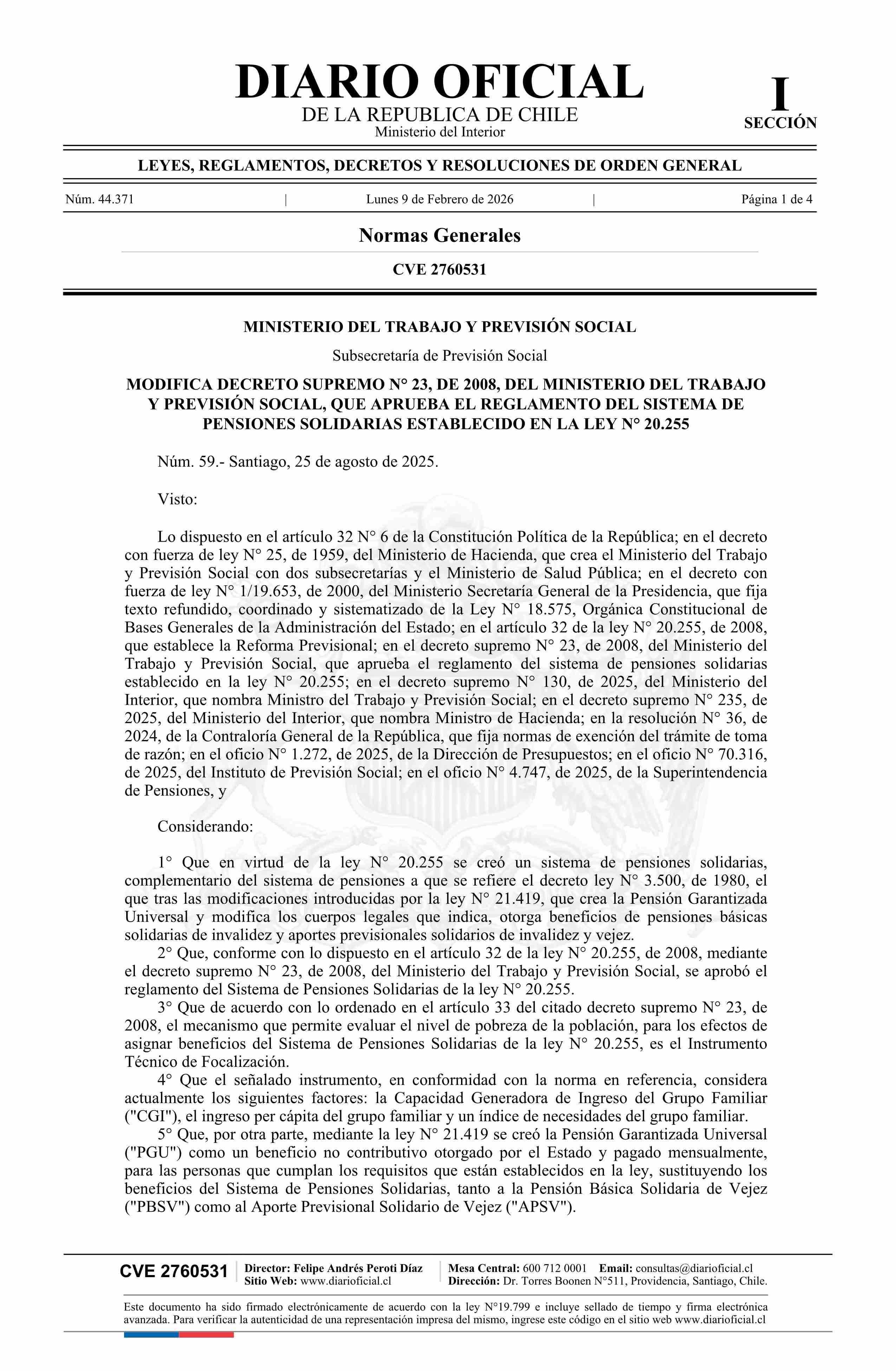 | Título: | Decreto número 59, de 2025.- Modifica decreto N° 23, de 2008, que aprueba el Reglamento del Sistema de Pensiones Solidarias establecido en la ley N° 20.255 |