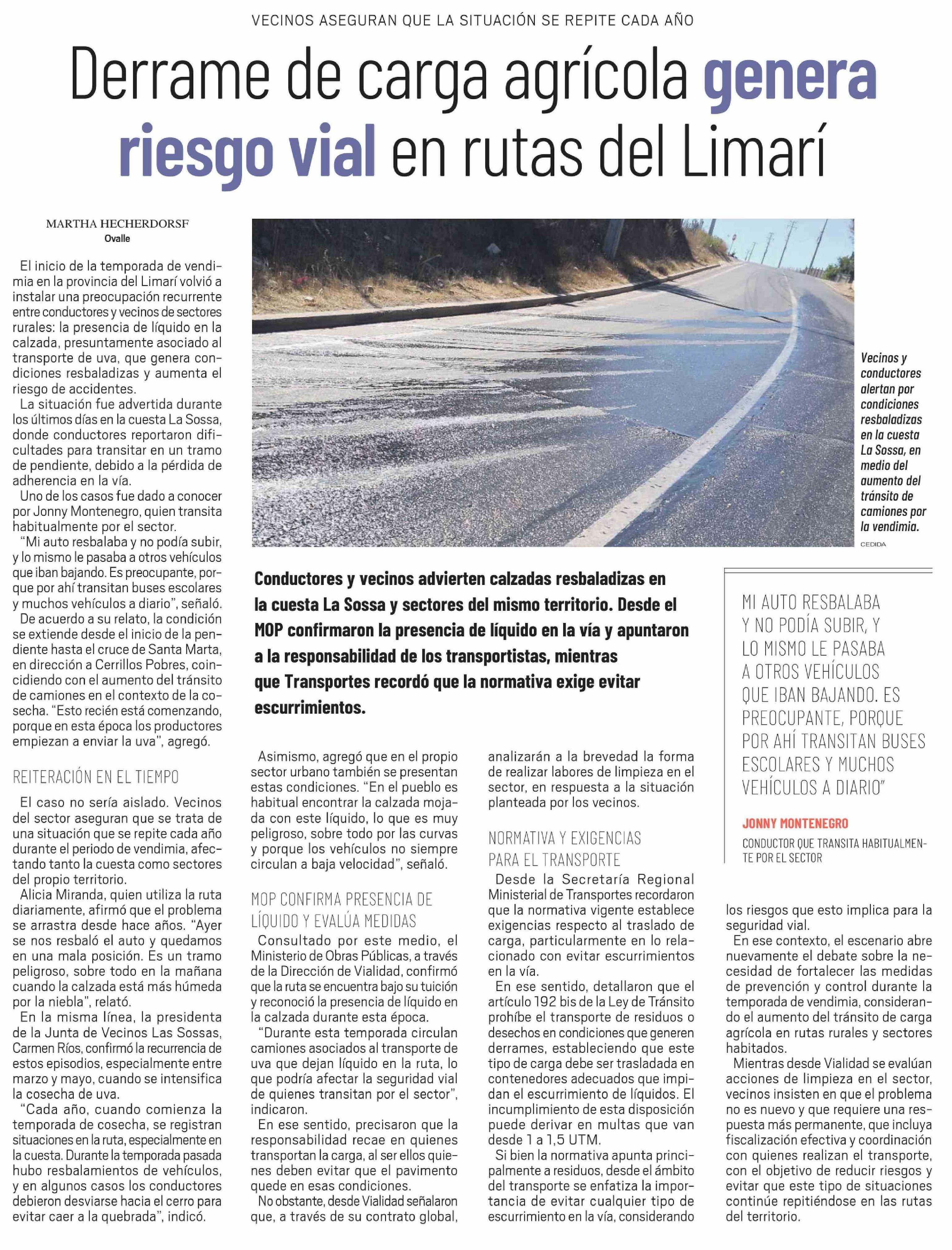 Derrame de carga agrícola genera riesgo vial en rutas del Limarí
