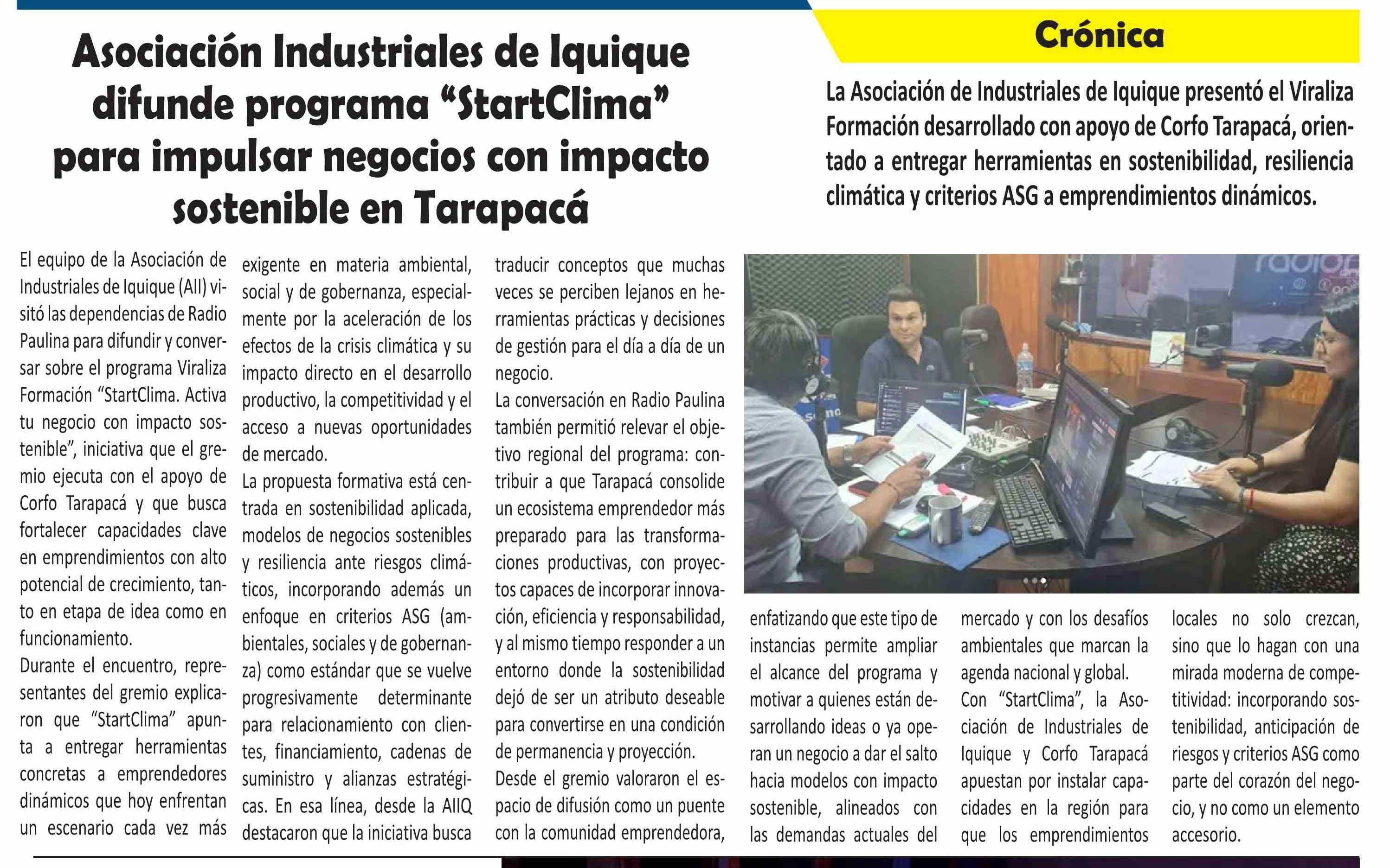 Asociación Industriales de Iquique difunde programa "StartClima" para impulsar negocios con impacto sostenible en Tarapacá