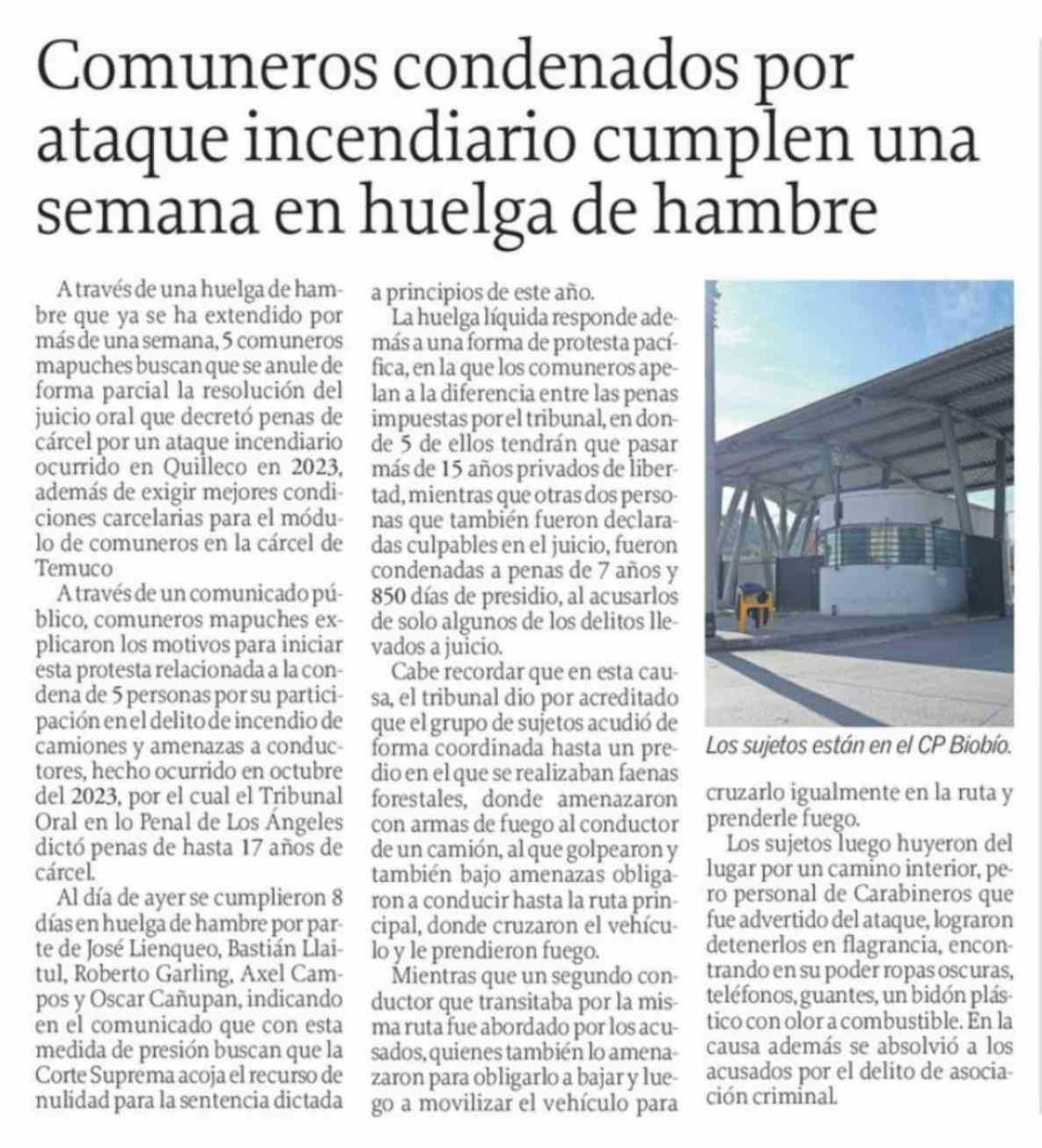 Comuneros condenados por ataque incendiario cumplen una semana en huelga de hambre