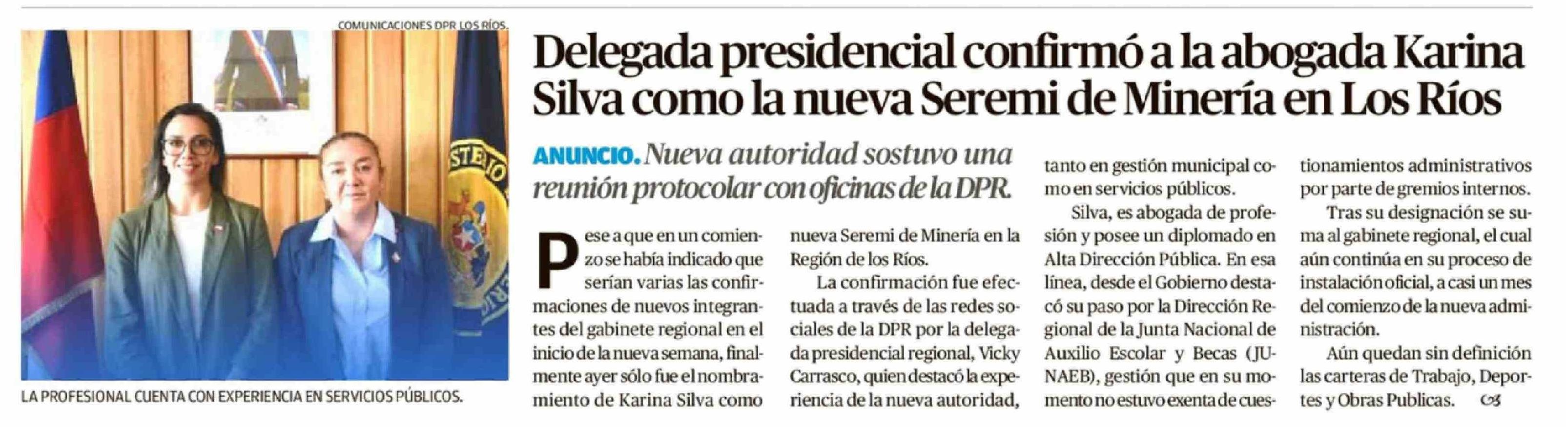 Delegada presidencial confirmó a la abogada Karina Silva como la nueva Seremi de Minería en Los Ríos