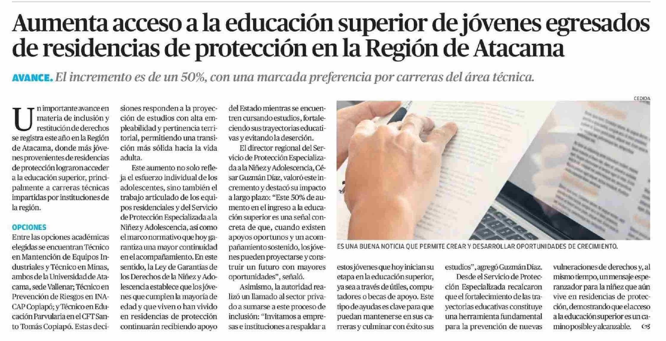 Aumenta acceso a la educación superior de jóvenes egresados de residencias de protección en la Región de Atacama