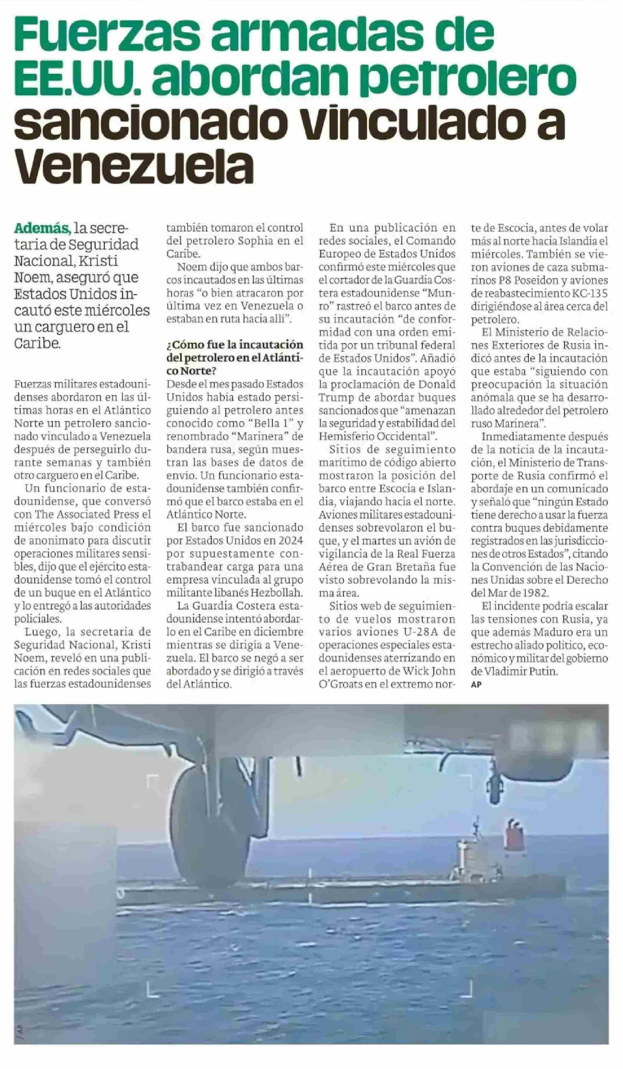 Título: Fuerzas armadas de EE.UU. abordan petrolero sancionado vinculado a Venezuela