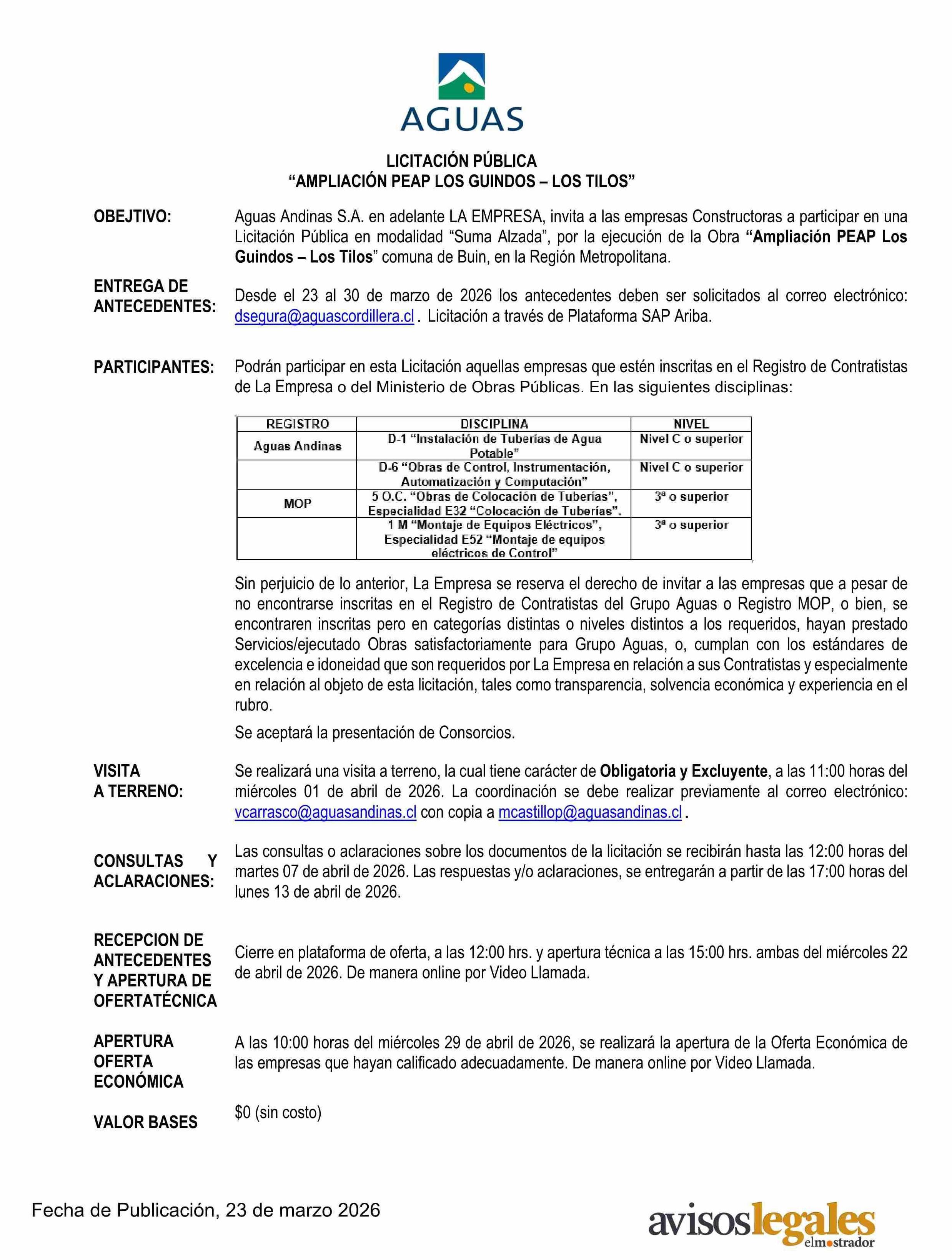 AVISO LICITACIONES: LICITACIÓN PÚBLICA “AMPLIACIÓN PEAP LOS GUINDOS - LOS TILOS”