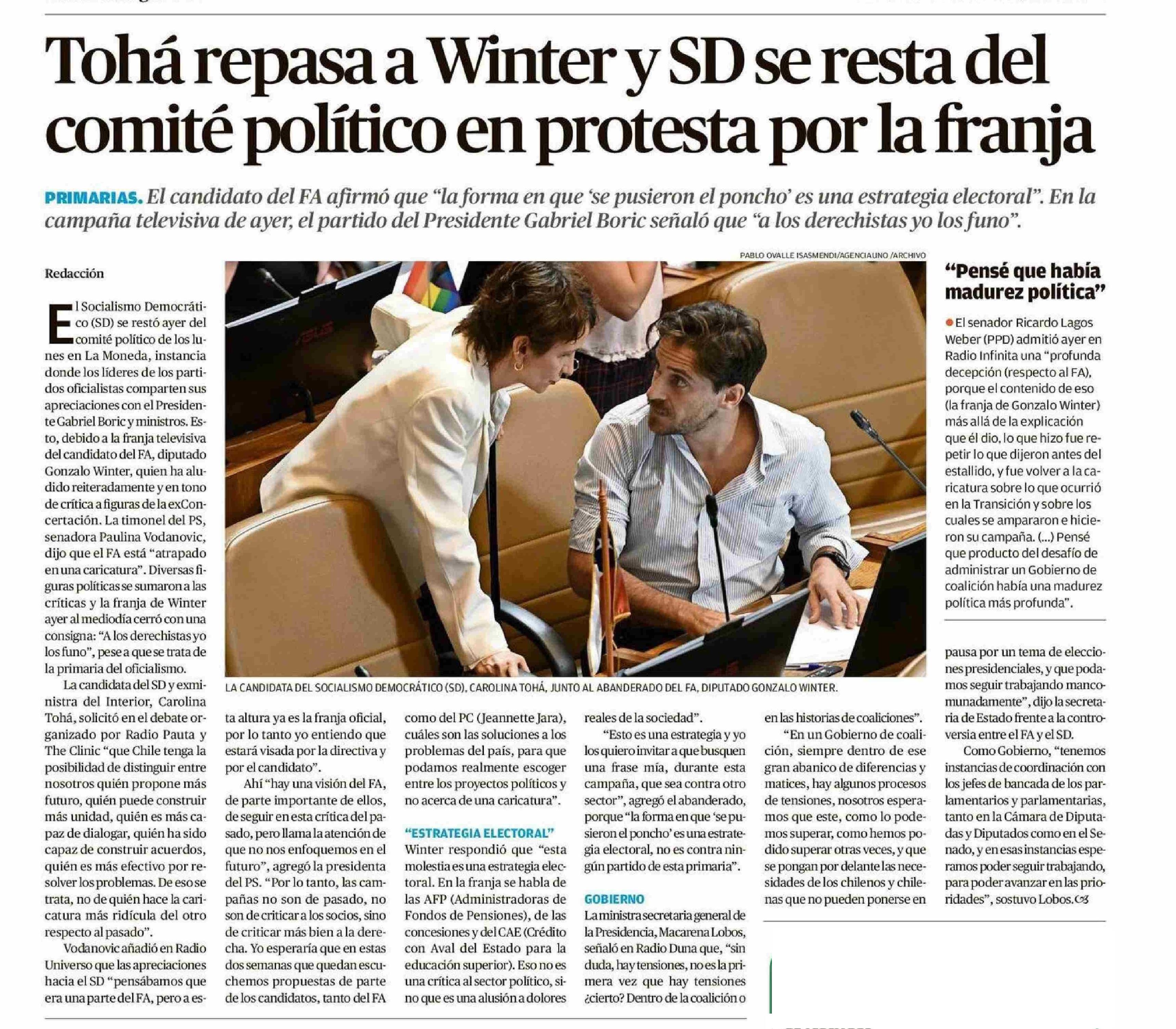 Tohá repasa a Winter y SD se resta del comité político en protesta por la franja