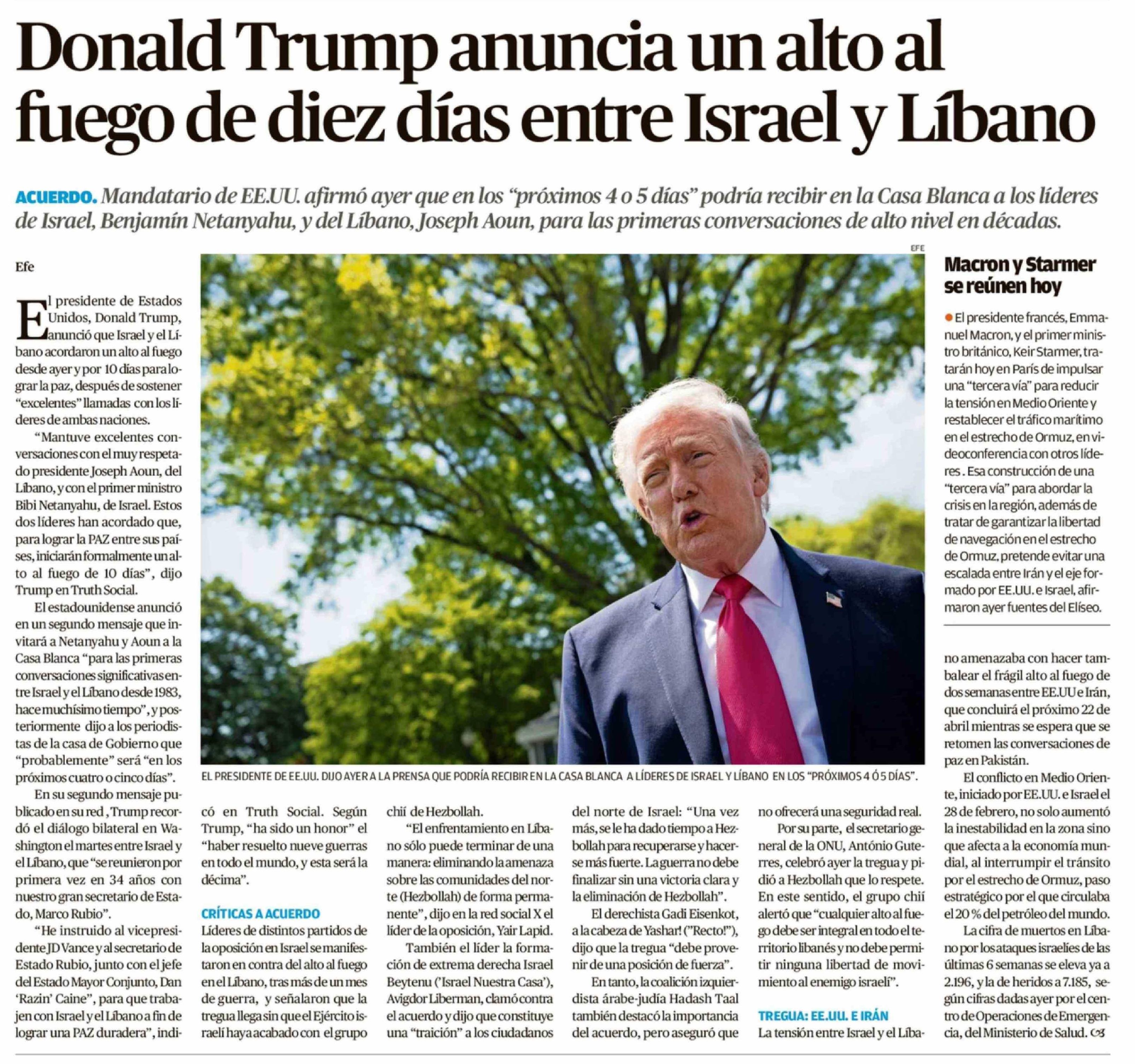 Donald Trump anuncia un alto al fuego de diez días entre Israel y Líbano