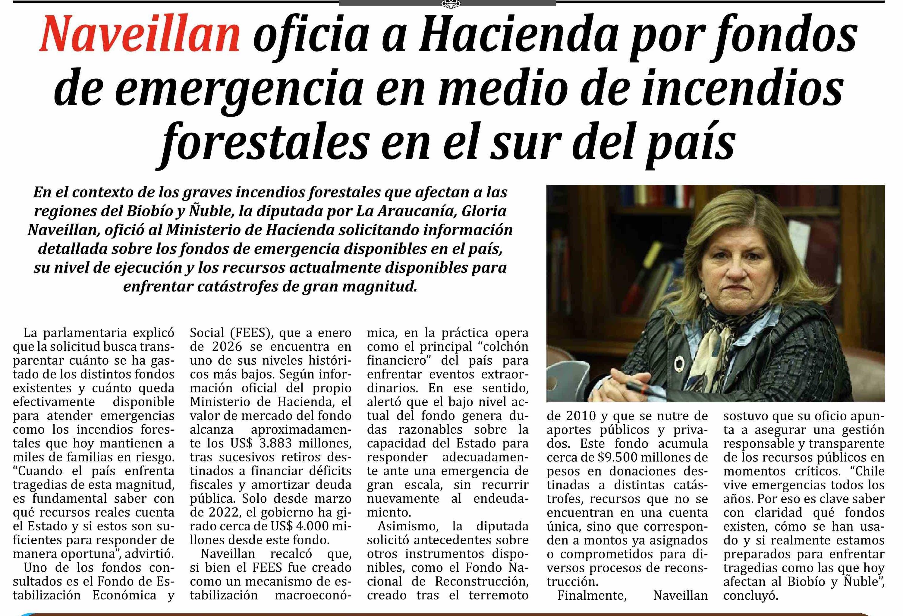 Naveillan oficia a Hacienda por fondos de emergencia en medio de incendios forestales en el sur del país